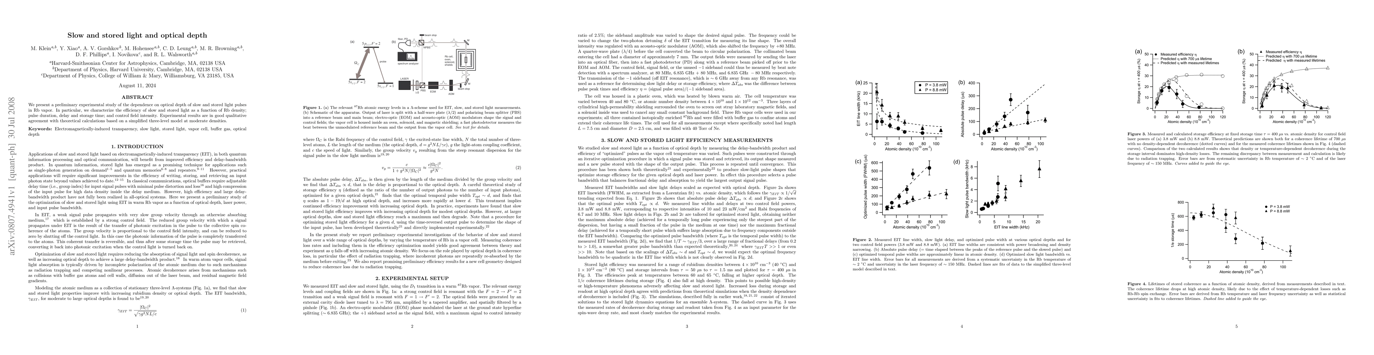 We present a preliminary experimental study of the dependence on optical depth of slow and stored light pulses in Rb vapor. In particular, we characterize the efficiency of slow and stored light as a function of Rb density; pulse duration, delay and storage time; and control field intensity. Experimental results are in good qualitative agreement with theoretical calculations based on a simplified three-level model at moderate densities.