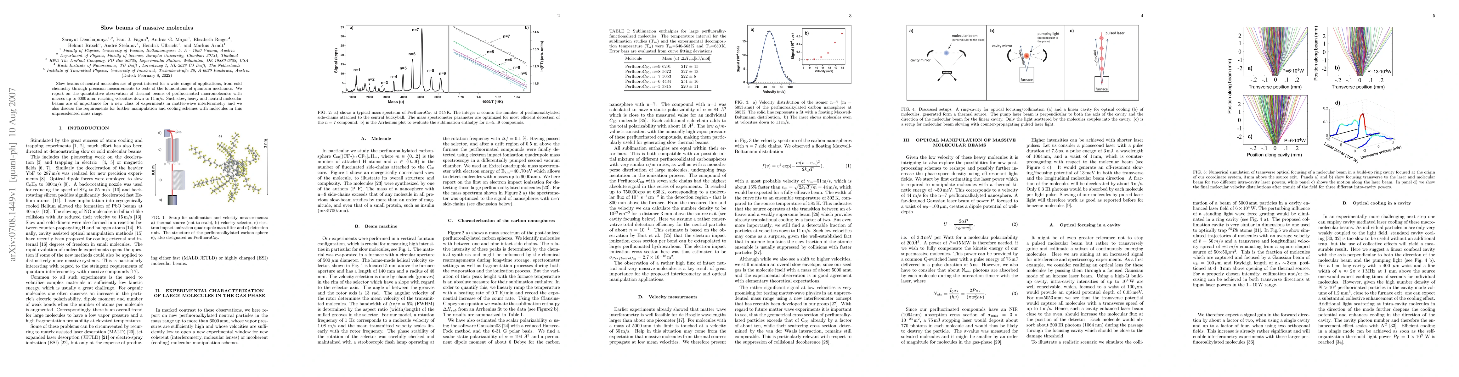 This paper reports on the successful generation and observation of thermal beams of perfluorinated macromolecules with masses up to 6000 amu, moving as slowly as 11 m/s, which are crucial for novel experiments in matter-wave interferometry and quantum mechanics tests. The study also outlines the necessary manipulation and cooling techniques for further experiments with such heavy molecules.