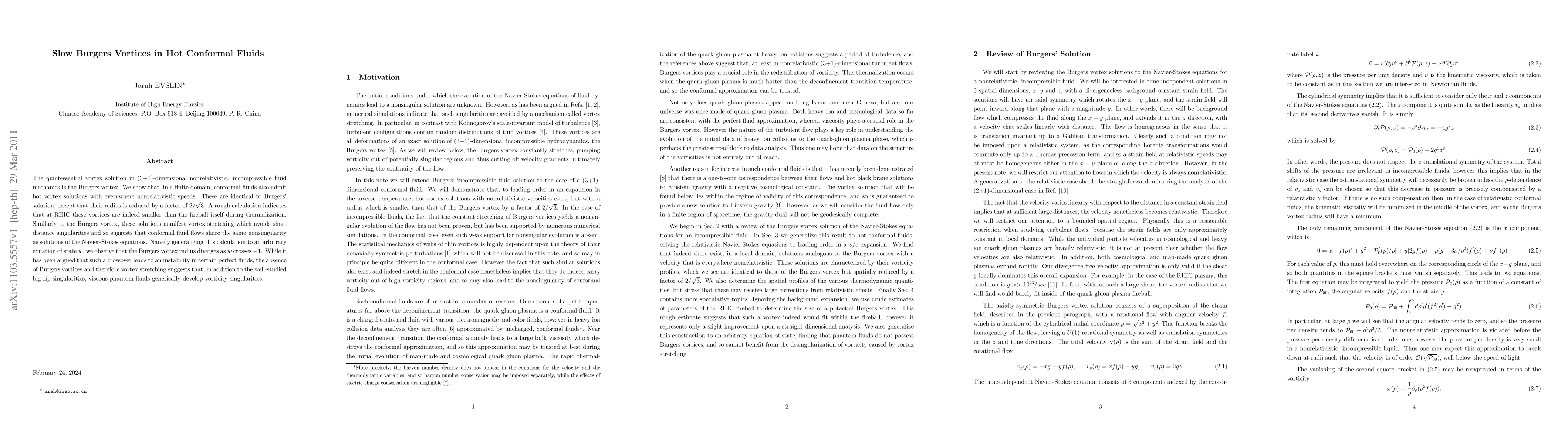 The quintessential vortex solution in (3+1)-dimensional nonrelativistic, incompressible fluid mechanics is the Burgers vortex. We show that, in a finite domain, conformal fluids also admit hot vortex solutions with everywhere nonrelativistic speeds. These are identical to Burgers' solution, except that their radius is reduced by a factor of 2/sqrt(3). A rough calculation indicates that at RHIC these vortices are indeed smaller than the fireball itself during thermalization. Similarly to the Burgers vortex, these solutions manifest vortex stretching which avoids short distance singularities and so suggests that conformal fluid flows share the same nonsingularity as solutions of the Navier-Stokes equations. Naively generalizing this calculation to an arbitrary equation of state w, we observe that the Burgers vortex radius diverges as w crosses -1. While it has been argued that such a crossover leads to an instability in certain perfect fluids, the absence of Burgers vortices and therefore vortex stretching suggests that, in addition to the well-studied big rip singularities, viscous phantom fluids generically develop vorticity singularities.