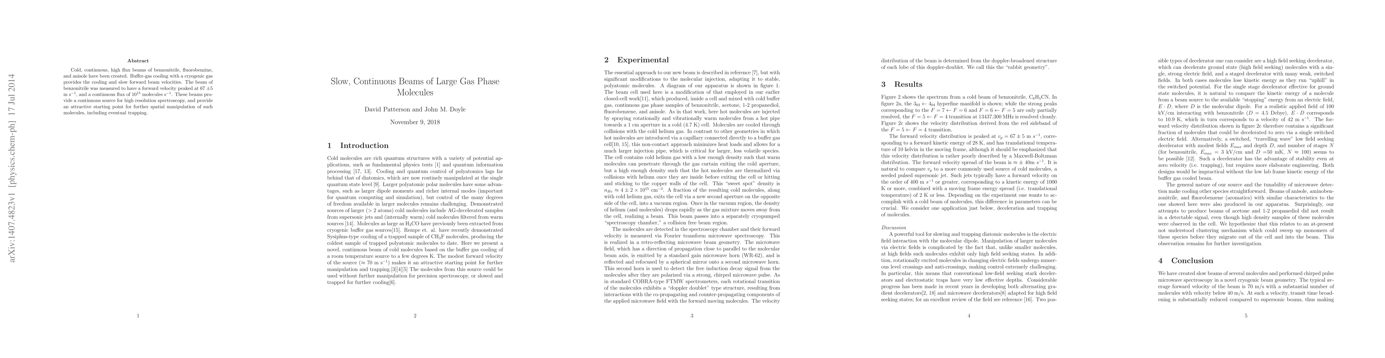 Cold, continuous, high flux beams of benzonitrile, fluorobenzine, and anisole have been created. Buffer-gas cooling with a cryogenic gas provides the cooling and slow forward beam velocities. The beam of benzonitrile was measured to have a forward velocity peaked at 67 $\pm 5$ m s$^{-1}$, and a continuous flux of $10^{15}$ molecules s$^{-1}$. These beams provide a continuous source for high resolution spectroscopy, and provide an attractive starting point for further spatial manipulation of such molecules, including eventual trapping.