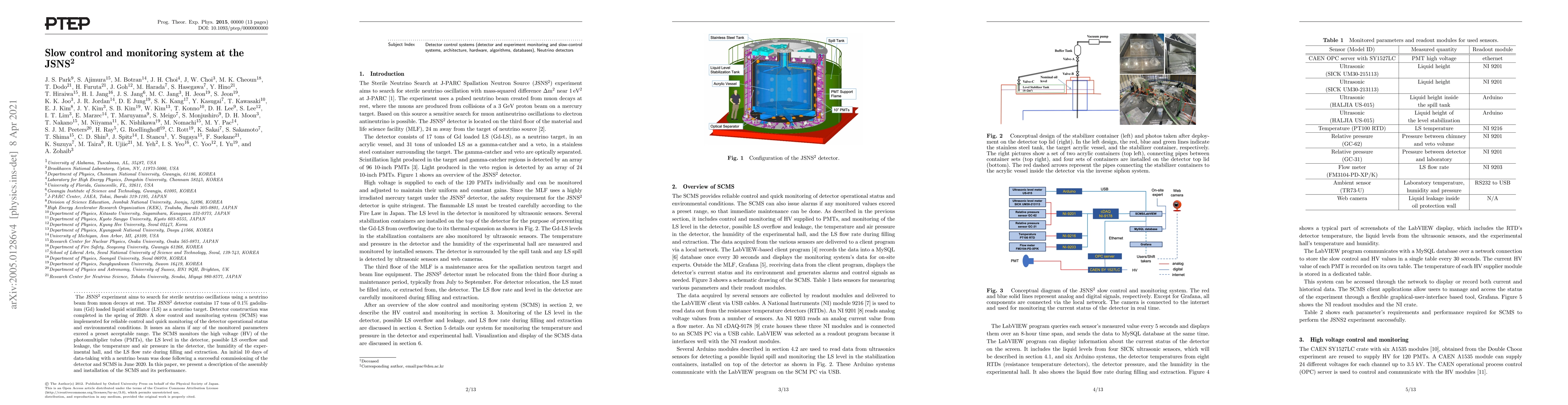 The JSNS$^2$ experiment is aimed to search for sterile neutrino oscillations using a neutrino beam from muon decays at rest. The JSNS$^2$ detector contains 17 tons of 0.1\% gadolinium (Gd) loaded liquid scintillator (LS) as a neutrino target. Detector construction was completed in the spring of 2020. A slow control and monitoring system (SCMS) was implemented for reliable control and quick monitoring of the detector operational status and environmental conditions. It issues an alarm if any of the monitored parameters exceed a preset acceptable range. The SCMS monitors the high voltage (HV) of the photomultiplier tubes (PMTs), the LS level in the detector, possible LS overflow and leakage, the temperature and air pressure in the detector, the humidity of the experimental hall, and the LS flow rate during filling and extraction. An initial 10 days of data-taking with a neutrino beam was done following a successful commissioning of the detector and SCMS in June 2020. In this paper, we present a description of the assembly and installation of the SCMS and its performance.