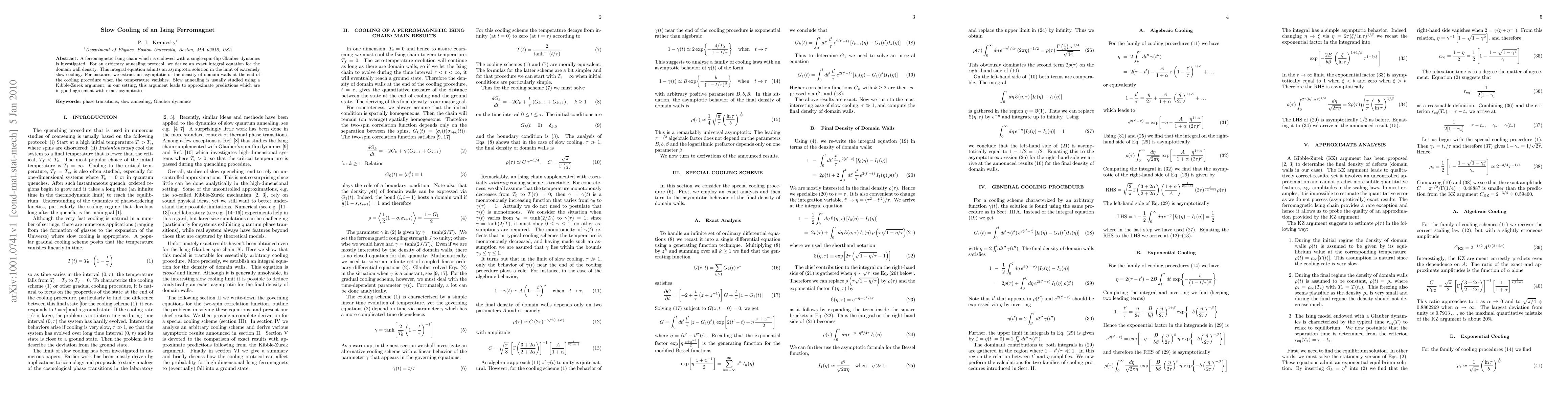 A ferromagnetic Ising chain which is endowed with a single-spin-flip Glauber dynamics is investigated. For an arbitrary annealing protocol, we derive an exact integral equation for the domain wall density. This integral equation admits an asymptotic solution in the limit of extremely slow cooling. For instance, we extract an asymptotic of the density of domain walls at the end of the cooling procedure when the temperature vanishes. Slow annealing is usually studied using a Kibble-Zurek argument; in our setting, this argument leads to approximate predictions which are in good agreement with exact asymptotics.