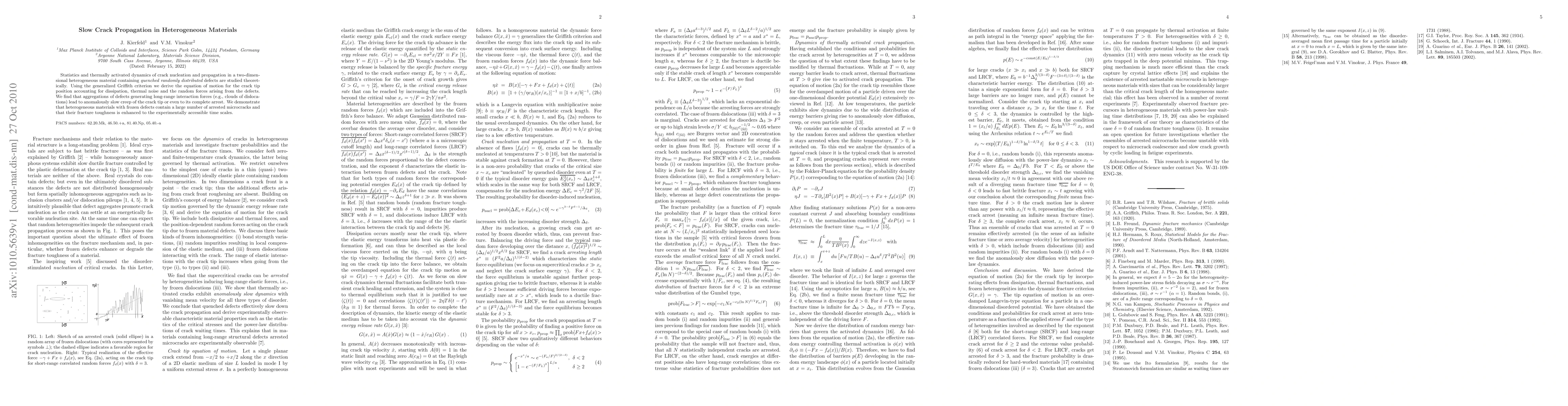 Statistics and thermally activated dynamics of crack nucleation and propagation in a two-dimensional heterogeneous material containing quenched randomly distributed defects are studied theoretically. Using the generalized Griffith criterion we derive the equation of motion for the crack tip position accounting for dissipation, thermal noise and the random forces arising from the defects. We find that aggregations of defects generating long-range interaction forces (e.g., clouds of dislocations) lead to anomalously slow creep of the crack tip or even to its complete arrest. We demonstrate that heterogeneous materials with frozen defects contain a large number of arrested microcracks and that their fracture toughness is enhanced to the experimentally accessible time scales.
