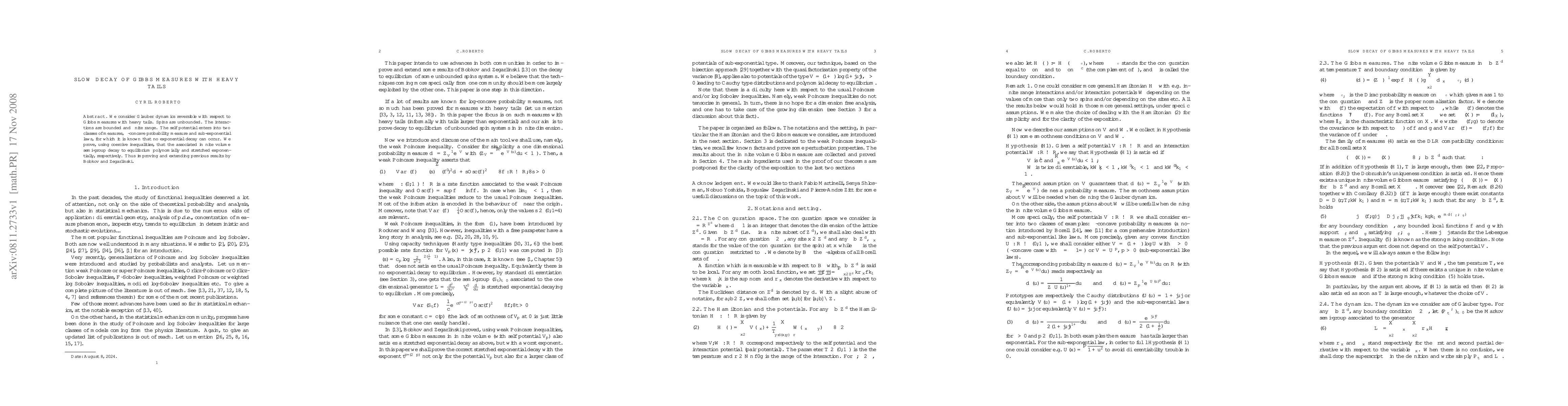 This paper investigates Gibbs measures with heavy tails under Glauber dynamics, showing that despite unbounded spins and bounded, finite-range interactions, the infinite volume semi-group decays to equilibrium polynomially or stretched exponentially, improving earlier results by Bobkov and Zegarlinski through the use of coercive inequalities.