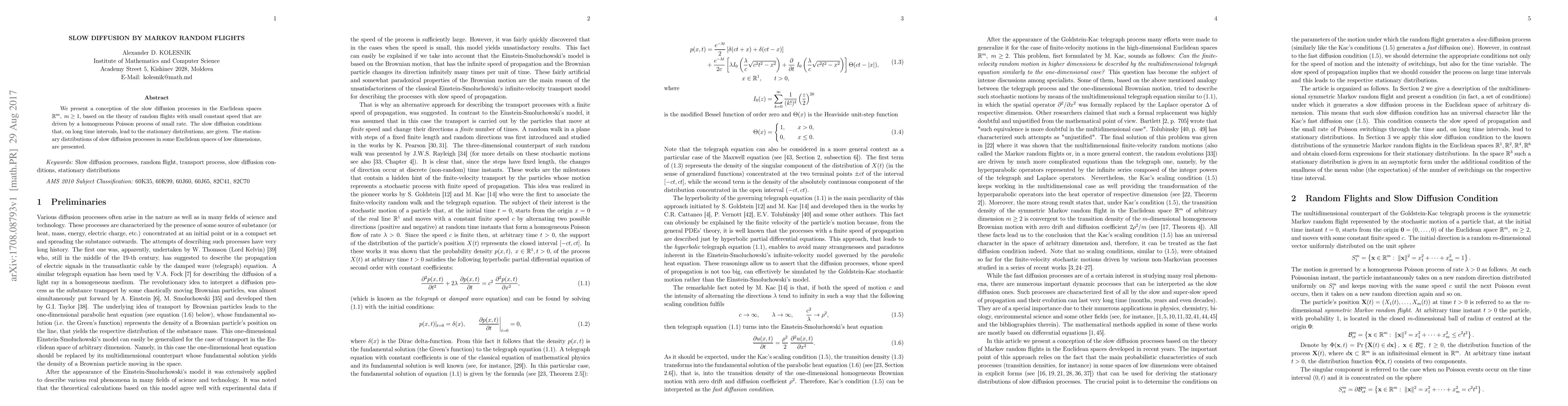 We present a conception of the slow diffusion processes in the Euclidean spaces $\Bbb R^m, \; m\ge 1$, based on the theory of random flights with small constant speed that are driven by a homogeneous Poisson process of small rate. The slow diffusion conditions that, on long time intervals, lead to the stationary distributions, are given. The stationary distributions of slow diffusion processes in some Euclidean spaces of low dimensions, are presented.