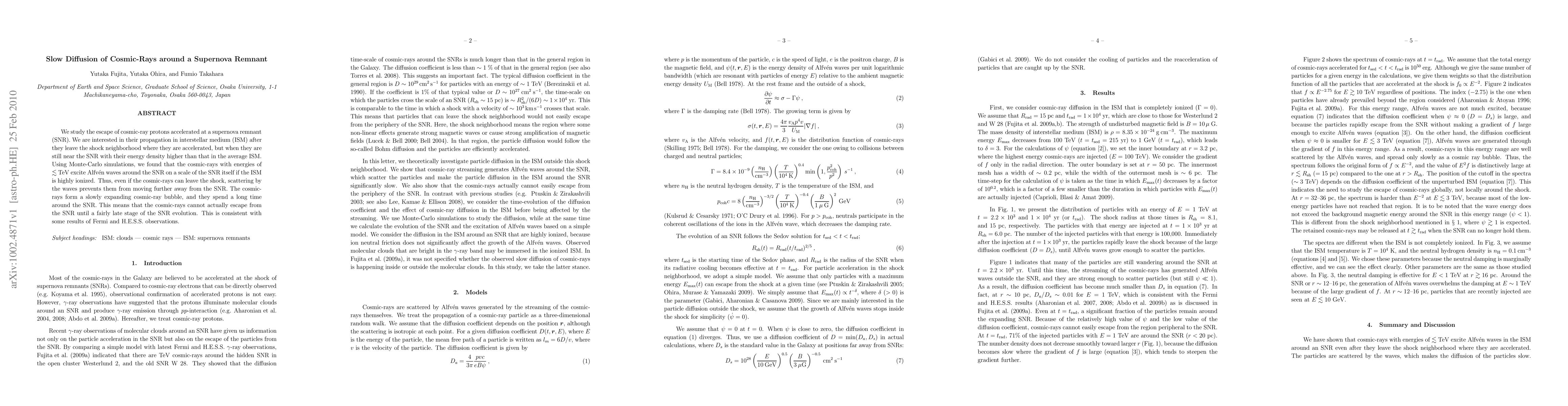 This study uses Monte-Carlo simulations to investigate the diffusion of cosmic-ray protons near a supernova remnant (SNR). The findings show that cosmic-rays, despite leaving the shock, remain confined due to scattering by Alfven waves in a highly ionized interstellar medium, forming a slowly expanding cosmic-ray bubble around the SNR.