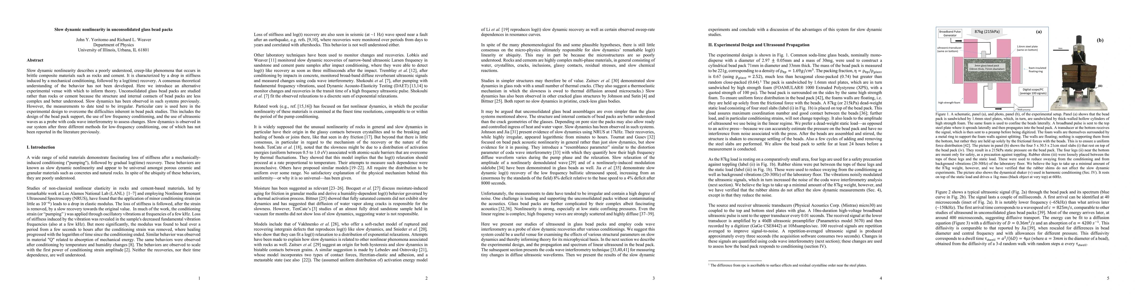 Researchers studied unconsolidated glass bead packs to investigate slow dynamic nonlinearity, a phenomenon characterized by a drop in stiffness followed by recovery, and observed it after low-frequency conditioning methods.