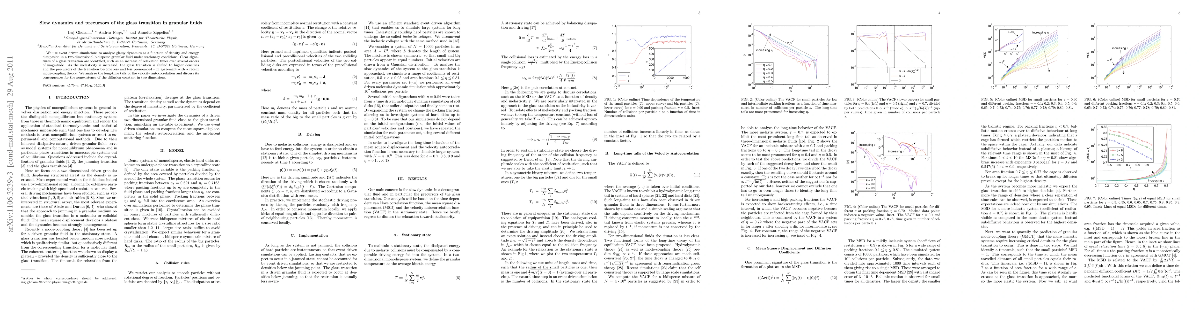 The paper presents a detailed analysis of glass transition in granular fluids using event-driven simulations, providing insights into long-time tails of VACF and the absence of a diffusion constant in two dimensions.