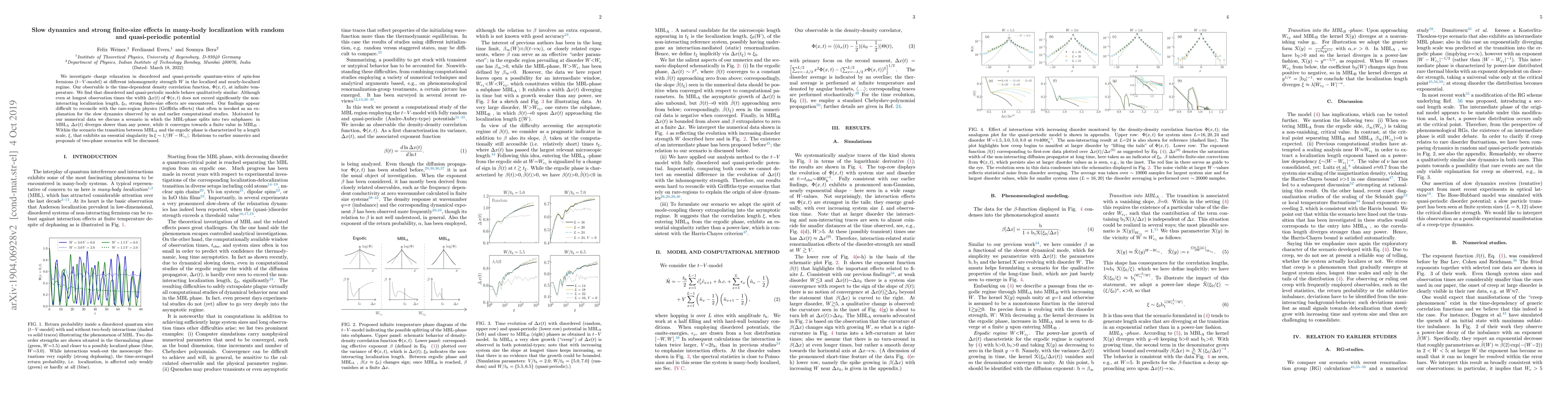 Researchers studied charge relaxation in disordered and quasi-periodic quantum wires, finding strong finite-size effects despite long observation times. They propose a two-phase scenario for the many-body localized regime, with different behaviors of the localization length at short and long times.