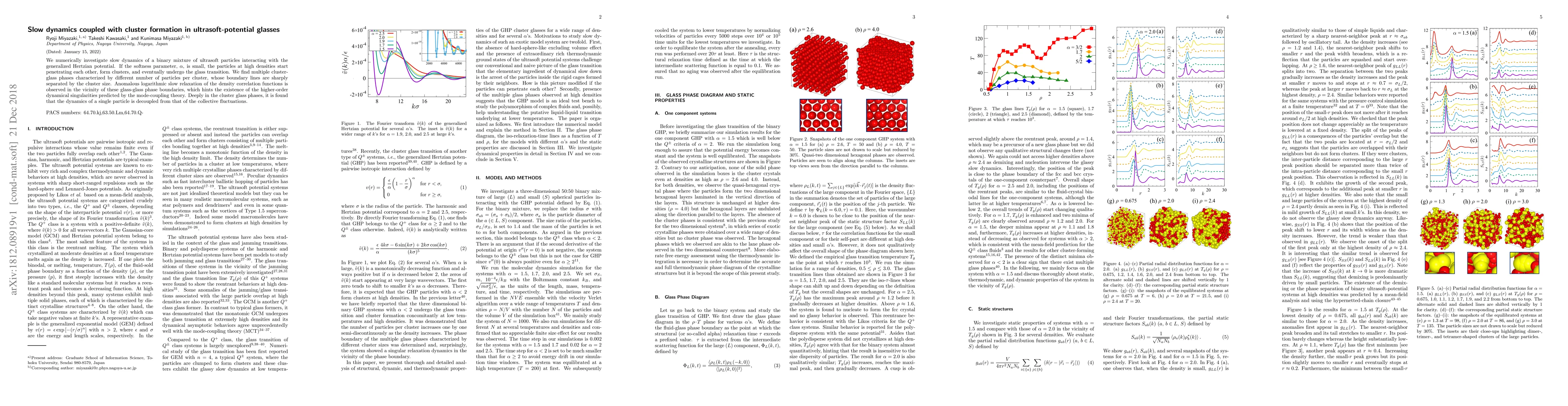 This paper investigates the slow dynamics and cluster formation in ultrasoft-potential glasses using numerical simulations. It reveals multiple cluster-glass phases with distinct particle clusters, showing anomalous logarithmic relaxation near phase boundaries and decoupling of single-particle dynamics from collective fluctuations in deep cluster glass phases.