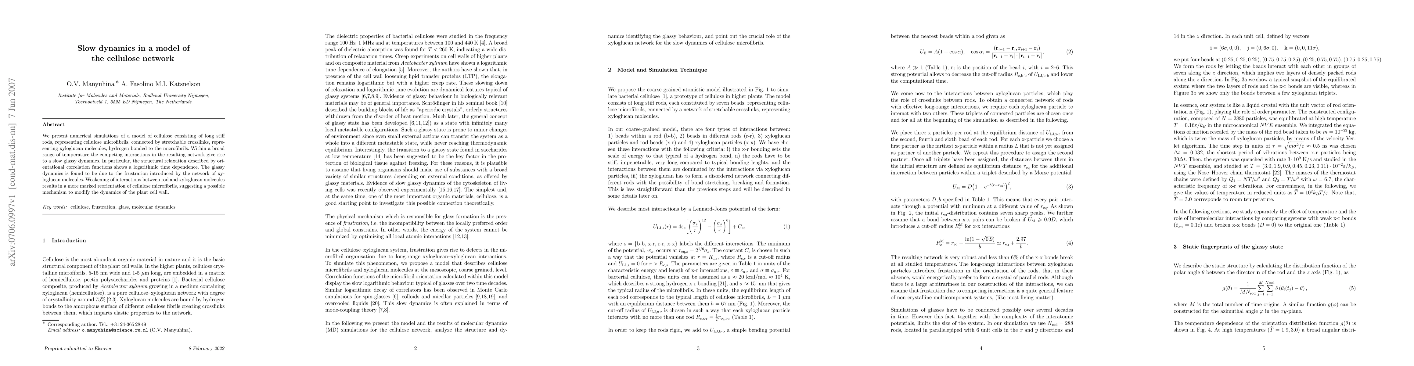 We present numerical simulations of a model of cellulose consisting of long stiff rods, representing cellulose microfibrils, connected by stretchable crosslinks, representing xyloglucan molecules, hydrogen bonded to the microfibrils. Within a broad range of temperature the competing interactions in the resulting network give rise to a slow glassy dynamics. In particular, the structural relaxation described by orientational correlation functions shows a logarithmic time dependence. The glassy dynamics is found to be due to the frustration introduced by the network of xyloglucan molecules. Weakening of interactions between rod and xyloglucan molecules results in a more marked reorientation of cellulose microfibrils, suggesting a possible mechanism to modify the dynamics of the plant cell wall.