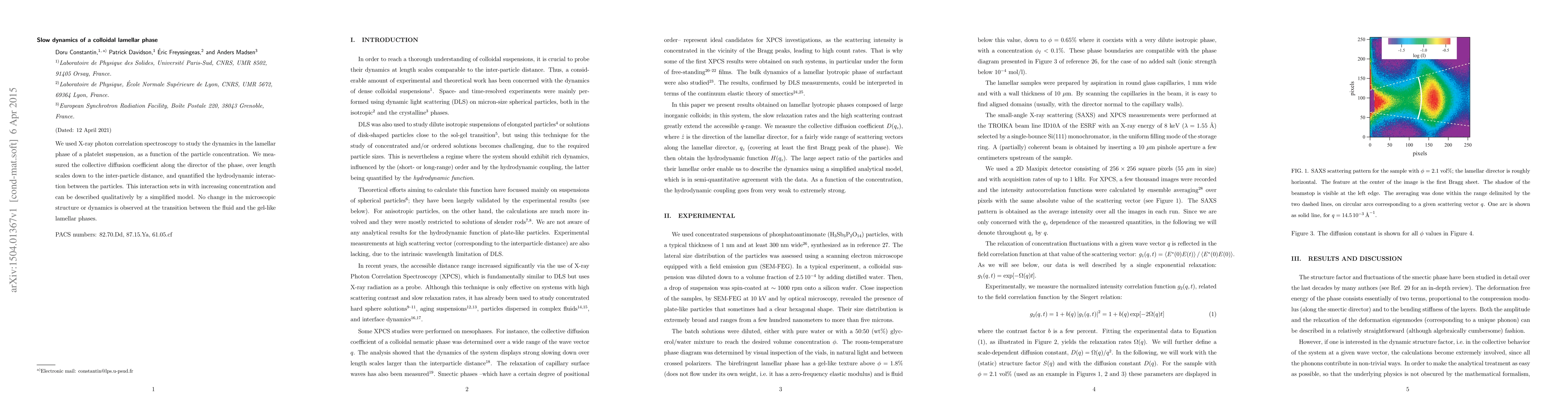 This study employs x-ray photon correlation spectroscopy to investigate the dynamics in a colloidal lamellar phase, revealing slow collective diffusion and hydrodynamic interactions that increase with particle concentration. No structural or dynamic changes are noted at the transition from fluid to gel-like lamellar phases.