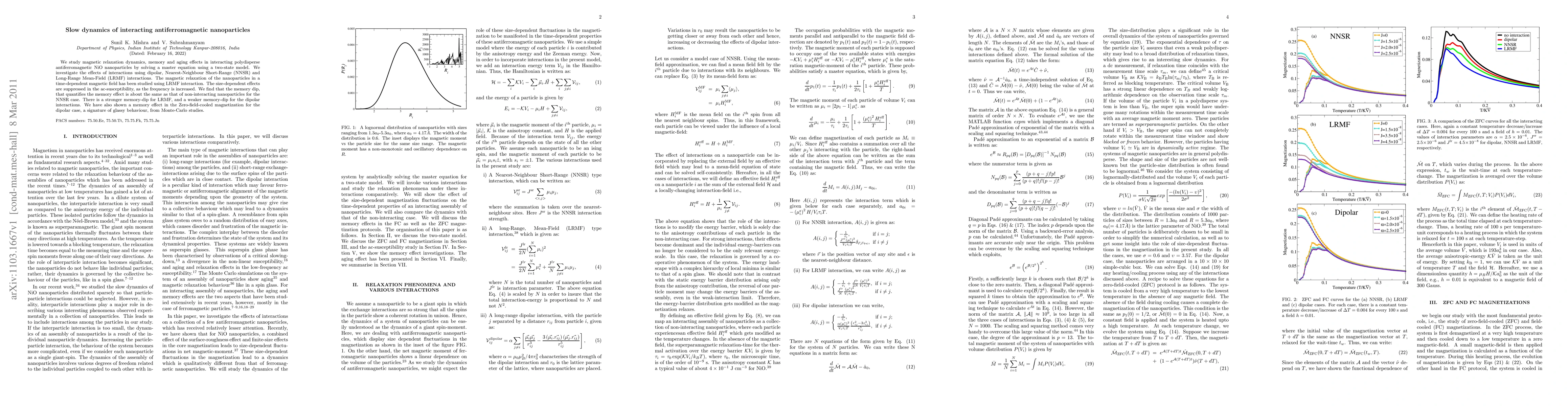We study magnetic relaxation dynamics, memory and aging effects in interacting polydisperse antiferromagnetic NiO nanoparticles by solving a master equation using a two-state model. We investigate the effects of interactions using dipolar, Nearest-Neighbour Short-Range (NNSR) and Long-Range Mean-Field (LRMF) interactions. The magnetic relaxation of the nanoparticles in a time-dependent magnetic field has been studied using LRMF interaction. The size-dependent effects are suppressed in the ac-susceptibility, as the frequency is increased. We find that the memory dip, that quantifies the memory effect is about the same as that of non-interacting nanoparticles for the NNSR case. There is a stronger memory-dip for LRMF, and a weaker memory-dip for the dipolar interactions. We have also shown a memory effect in the Zero-field-cooled magnetization for the dipolar case, a signature of glassy behaviour, from Monte-Carlo studies.