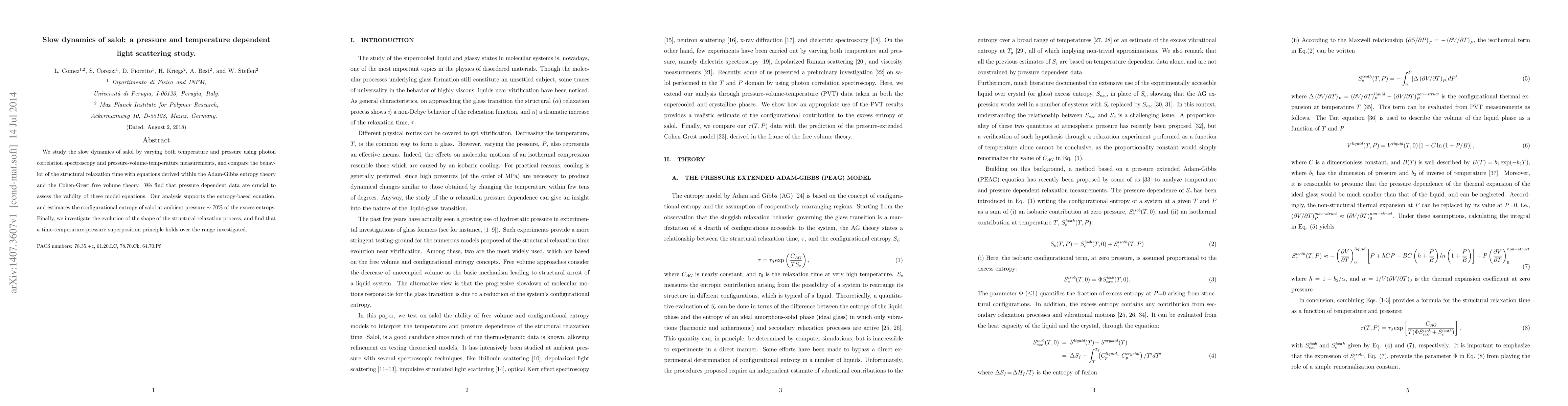 We study the slow dynamics of salol by varying both temperature and pressure using photon correlation spectroscopy and pressure-volume-temperature measurements, and compare the behavior of the structural relaxation time with equations derived within the Adam-Gibbs entropy theory and the Cohen-Grest free volume theory. We find that pressure dependent data are crucial to assess the validity of these model equations. Our analysis supports the entropy-based equation, and estimates the configurational entropy of salol at ambient pressure ? 70% of the excess entropy. Finally, we investigate the evolution of the shape of the structural relaxation process, and find that a time-temperature-pressure superposition principle holds over the range investigated.