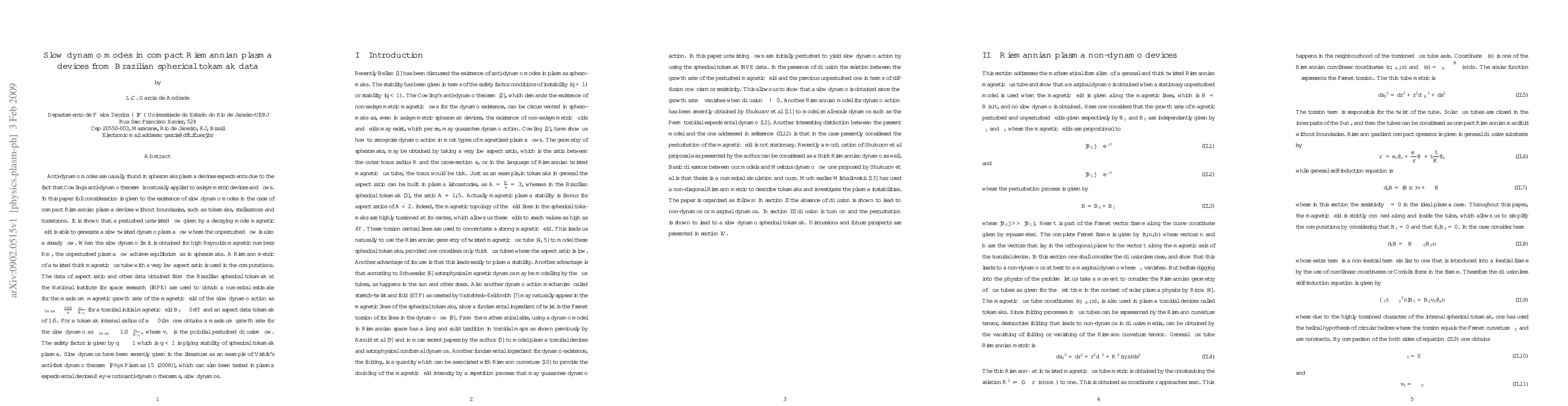 Anti-dynamo modes are usually found in spheromaks plasma devices experiments due to the fact that Cowling anti-dynamo theorem is naturally applied to axisymmetric devices and flows. In this paper full consideration is given to the existence of slow dynamo modes in the case of compact Riemannian plasma devices without boundaries, such as tokamaks, stellarators and torsatrons. It is shown that a perturbed untwisted flow given by a decaying mode magnetic field is able to generate a slow twisted dynamo plasma flow where the unperturbed flow is also a steady flow. When the slow dynamo limit is obtained for high Reynolds magnetic numbers $Rm$, the unperturbed plasma flow achieve equilibrium as in spheromaks. The data of aspect ratio and other data obtained from the Brazilian spherical tokamak at the National institute for space research are used to obtain a numerical estimate for the maximum magnetic growth rate of the magnetic field of the slow dynamo action as ${\gamma}_{1max}\approx{\frac{0.26}{a}{\times}\frac{v_{1{\theta}}}{B_{1s}}}$ for a toroidal initial magnetic field $B_{0}\approx{0.4T}$ and an aspect data tokamak of 1.5. For a tokamak internal radius of $a\approx{0.2m}$ one obtains a maximum growth rate for the slow dynamo as ${\gamma}_{1max}\approx{1.3{\times}\frac{v_{1{\theta}}}{B_{1s}}}$, where $v_{1{\theta}}$ is the poloidal perturbed diffusive flow. The safety factor is given by $q\approx{-1}$ which is $q<1$ implying stability of spherical tokamak plasma.