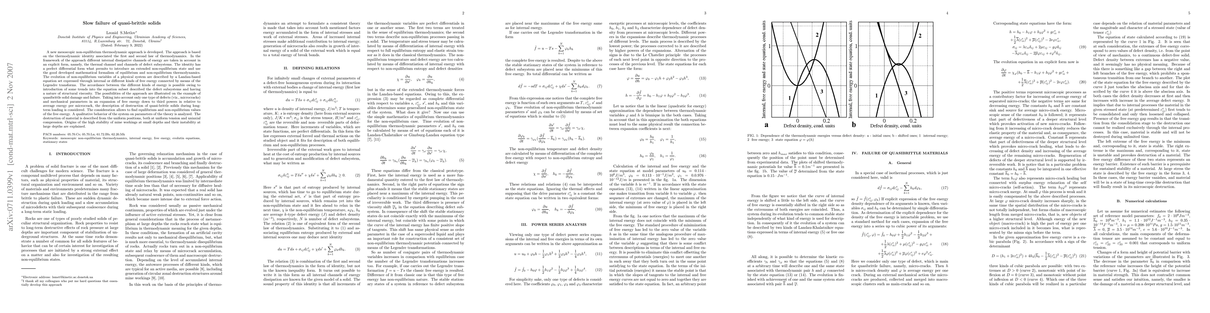 Researchers develop a new thermodynamic approach to study slow failure of quasi-brittle solids, considering energy dissipation channels like thermal and defect subsystems.