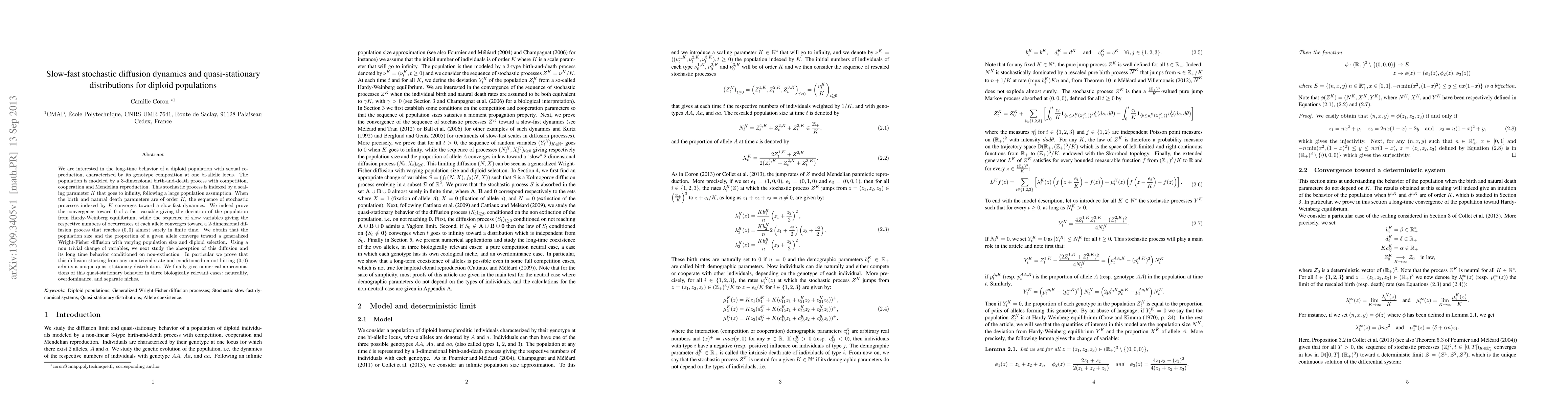 This paper investigates the long-term dynamics of a diploid population with sexual reproduction, modeled by a 3-dimensional birth-and-death process. It demonstrates the convergence of the population dynamics to a slow-fast stochastic diffusion, revealing a unique quasi-stationary distribution when the population does not go extinct. Numerical approximations are provided for neutrality, overdominance, and separate niches scenarios.