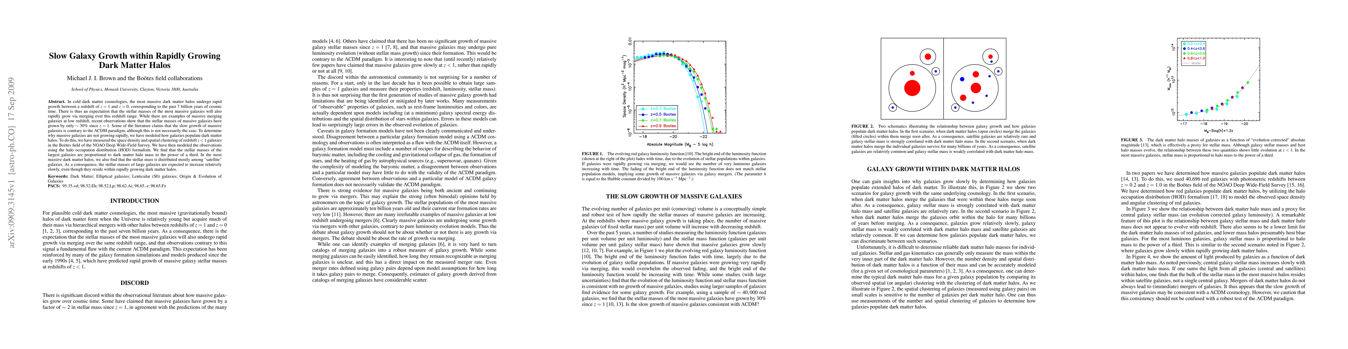This paper investigates the discrepancy between the rapid growth of massive dark matter halos and the slower growth of the stellar masses of the most massive galaxies. The study finds that despite the rapid growth of dark matter halos, the stellar masses of large galaxies increase slowly due to the majority of stellar mass being distributed among satellite galaxies within these halos.