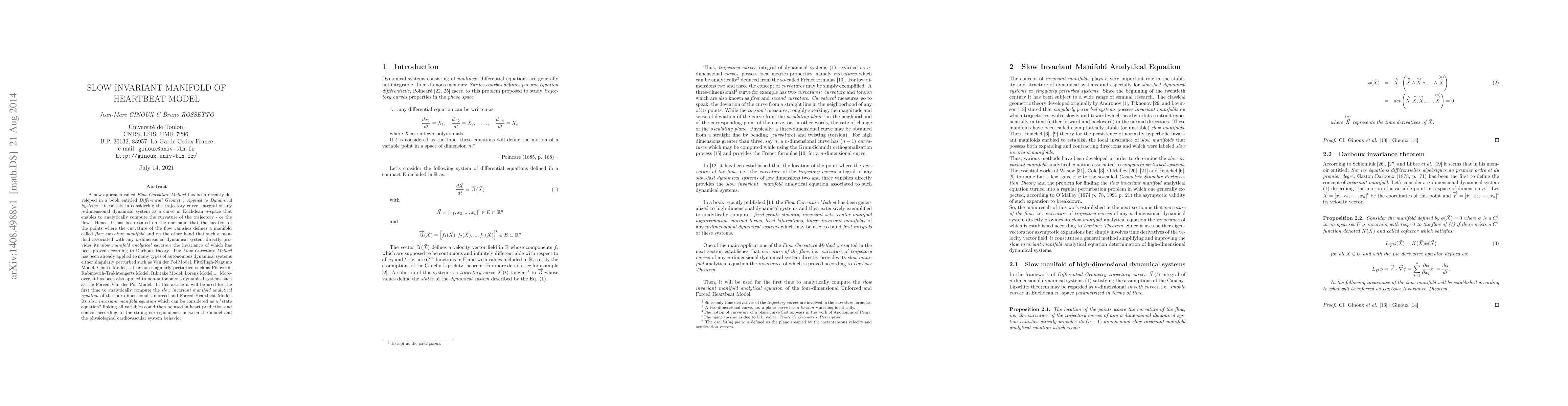 A new approach called Flow Curvature Method has been recently developed in a book entitled Differential Geometry Applied to Dynamical Systems. It consists in considering the trajectory curve, integral of any n-dimensional dynamical system as a curve in Euclidean n-space that enables to analytically compute the curvature of the trajectory - or the flow. Hence, it has been stated on the one hand that the location of the points where the curvature of the flow vanishes defines a manifold called flow curvature manifold and on the other hand that such a manifold associated with any n-dimensional dynamical system directly provides its slow manifold analytical equation the invariance of which has been proved according to Darboux theory. The Flow Curvature Method has been already applied to many types of autonomous dynamical systems either singularly perturbed such as Van der Pol Model, FitzHugh-Nagumo Model, Chua's Model, ...) or non-singularly perturbed such as Pikovskii-Rabinovich-Trakhtengerts Model, Rikitake Model, Lorenz Model,... More- over, it has been also applied to non-autonomous dynamical systems such as the Forced Van der Pol Model. In this article it will be used for the first time to analytically compute the slow invariant manifold analytical equation of the four-dimensional Unforced and Forced Heartbeat Model. Its slow invariant manifold equation which can be considered as a "state equation" linking all variables could then be used in heart prediction and control according to the strong correspondence between the model and the physiological cardiovascular system behavior.