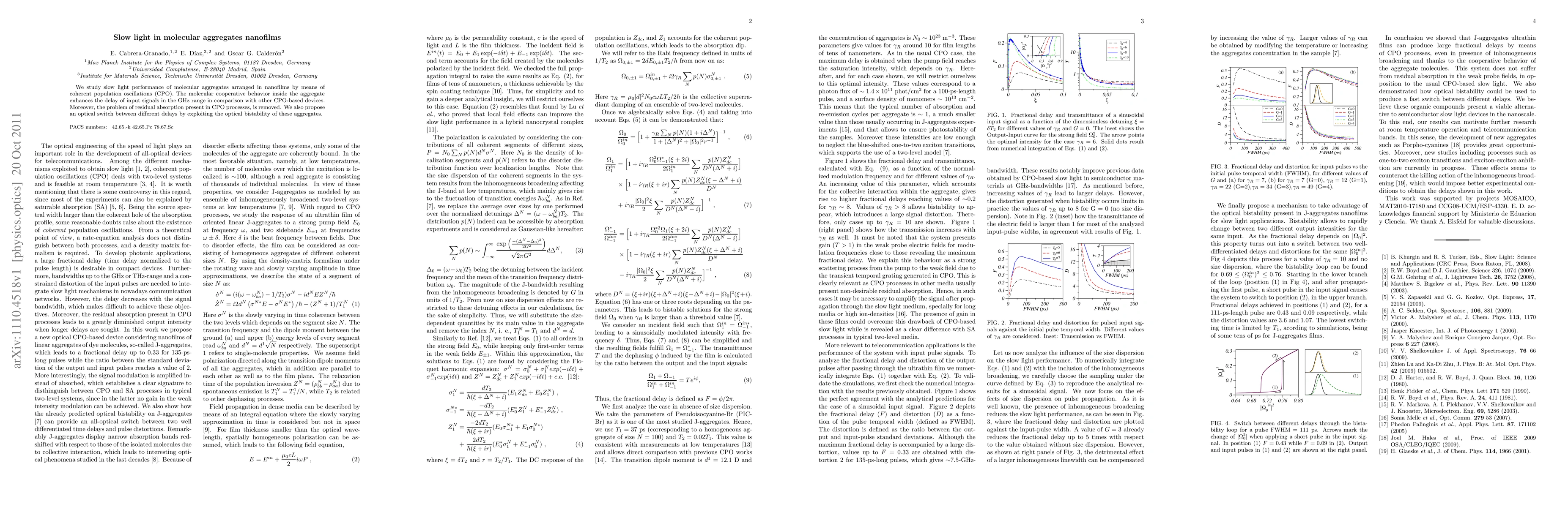 This paper investigates the slow light performance of molecular aggregates in nanofilms using coherent population oscillations, demonstrating significant signal delay enhancement and eliminating residual absorption issues. An optical switch for varying delays is proposed through the aggregates' optical bistability.