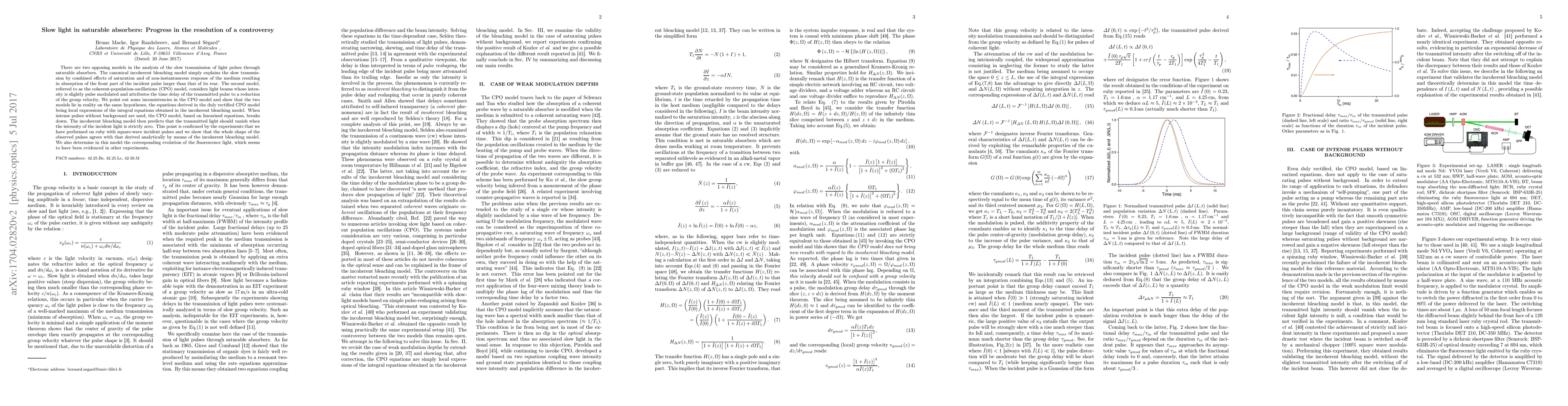 This paper resolves a controversy regarding slow light transmission through saturable absorbers, showing that both the incoherent bleaching and coherent-population-oscillations models are consistent when properly rectified. Experimental results on ruby confirm the predictions of the incoherent bleaching model for large modulation indices.
