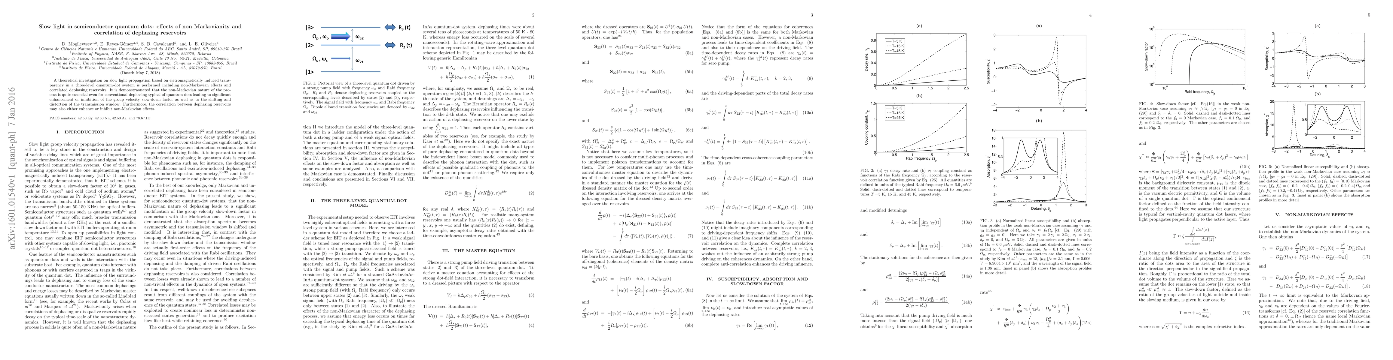 A theoretical investigation on slow light propagation based on eletromagnetically induced transparency in a three-level quantum-dot system is performed including non-Markovian effects and correlated dephasing reservoirs. It is demonstraonated that the non-Markovian nature of the process is quite essential even for conventional dephasing typical of quantum dots leading to significant enhancement or inhibition of the group velocity slow-down factor as well as to the shifting and distortion of the transmission window. Furthermore, the correlation between dephasing reservoirs may also either enhance or inhibit non-Markovian effects.