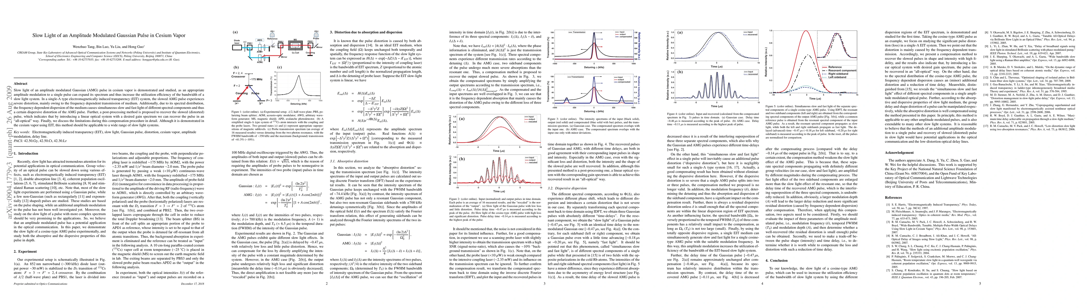 This paper investigates the slow light of an amplitude modulated Gaussian pulse in cesium vapor, demonstrating its spectral expansion and bandwidth efficiency. It addresses the severe distortion of the slowed pulse in a single-Λ EIT system due to frequency-dependent transmission and dispersion, proposing an "all-optical" post-processing method for recovery and discussing its limitations.