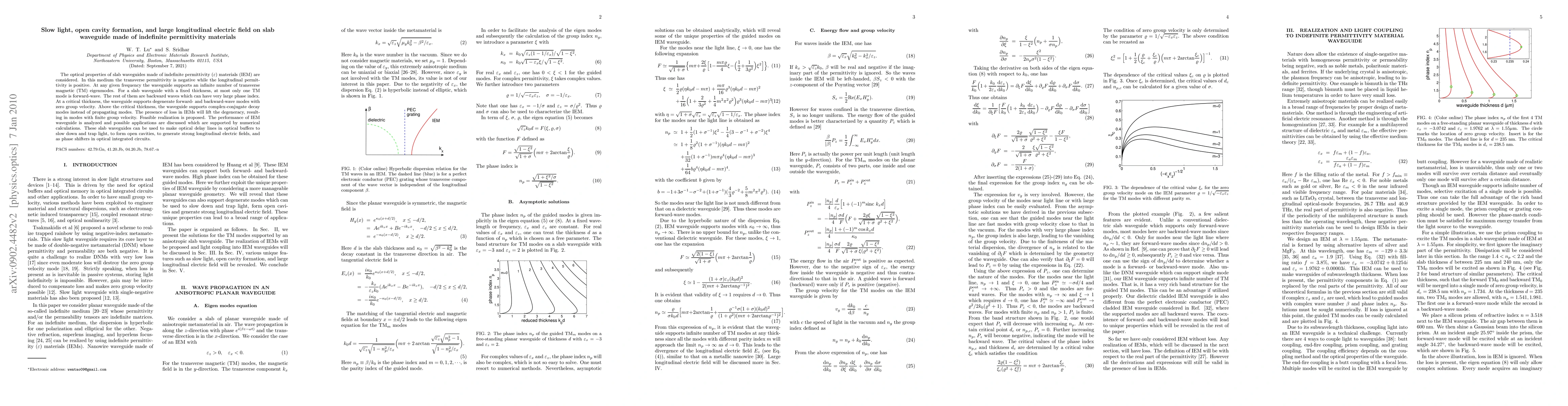 This paper explores the optical properties of slab waveguides made from indefinite permittivity materials (IEM), where the waveguide supports infinite transverse magnetic modes, with potential for slow light, open cavity formation, and large longitudinal electric fields. The study proposes feasible realizations and discusses applications such as optical delay lines and phase shifters.