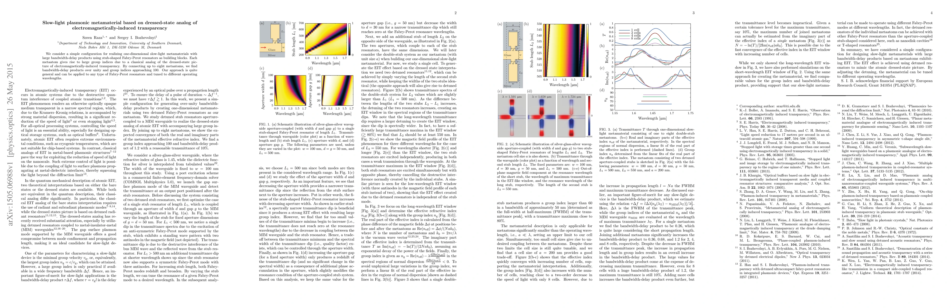 This paper proposes a one-dimensional slow-light metamaterial using stub-shaped Fabry-Perot resonators, achieving large group indices and bandwidth-delay products through a dressed-state analog of electromagnetically-induced transparency. The method is versatile and can be adapted for various resonators and wavelengths.