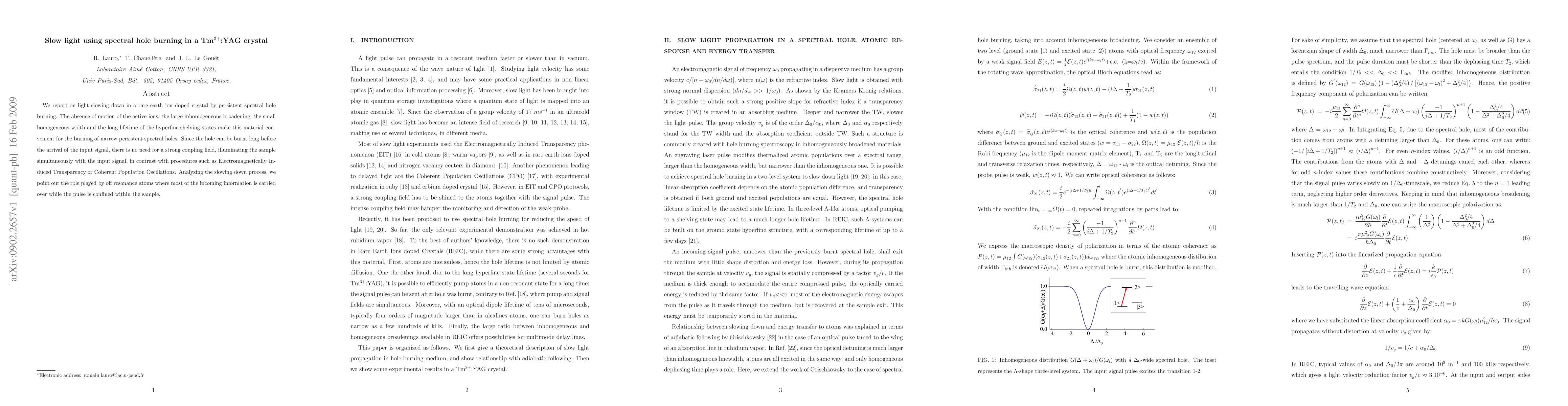 We report on light slowing down in a rare earth ion doped crystal by persistent spectral hole burning. The absence of motion of the active ions, the large inhomogeneous broadening, the small homogeneous width and the long lifetime of the hyperfine shelving states make this material convenient for the burning of narrow persistent spectral holes. Since the hole can be burnt long before the arrival of the input signal, there is no need for a strong coupling field, illuminating the sample simultaneously with the input signal, in contrast with procedures such as Electromagnetically Induced Transparency or Coherent Population Oscillations. Analyzing the slowing down process, we point out the role played by off resonance atoms where most of the incoming information is carried over while the pulse is confined within the sample.