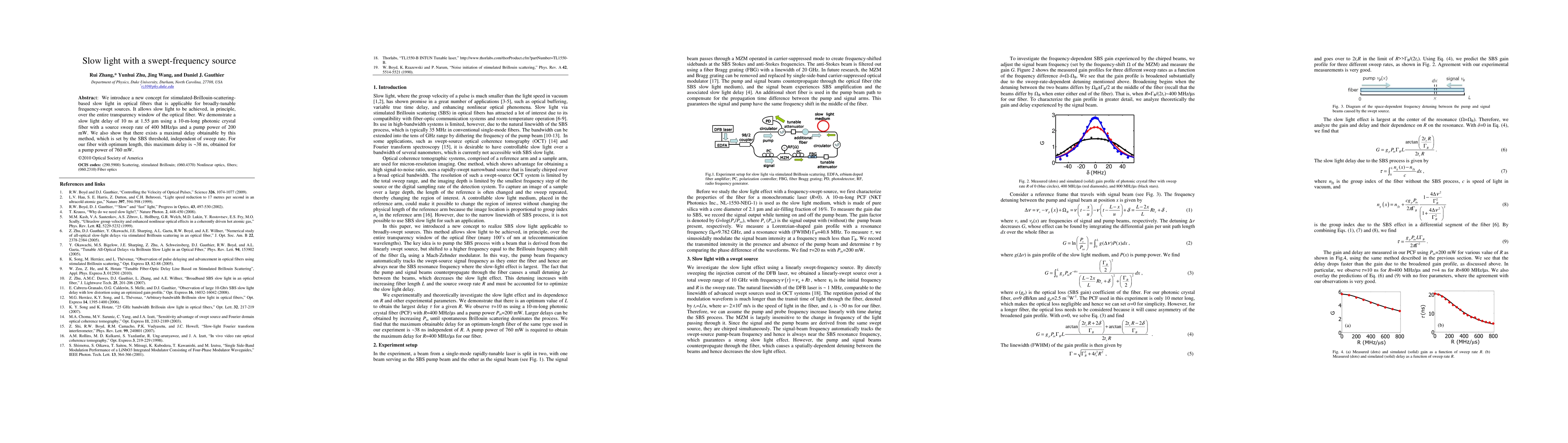This paper proposes a novel method for achieving slow light using stimulated Brillouin scattering in optical fibers with frequency-swept sources, demonstrating a delay of 10 ns at 1550 nm. It identifies a maximum delay of ~38 ns, limited by the SBS threshold rather than the sweep rate.