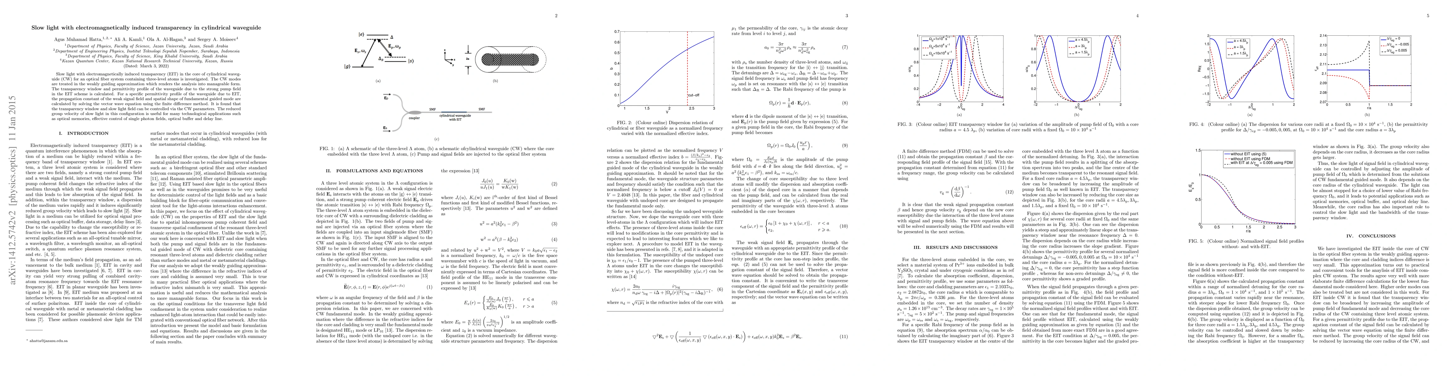 This paper investigates slow light effects in cylindrical waveguides using electromagnetically induced transparency (EIT) with three-level atoms. It calculates the transparency window and permittivity profile, finding that the slow light properties can be controlled by waveguide parameters, with applications in optical memories and photonic devices.