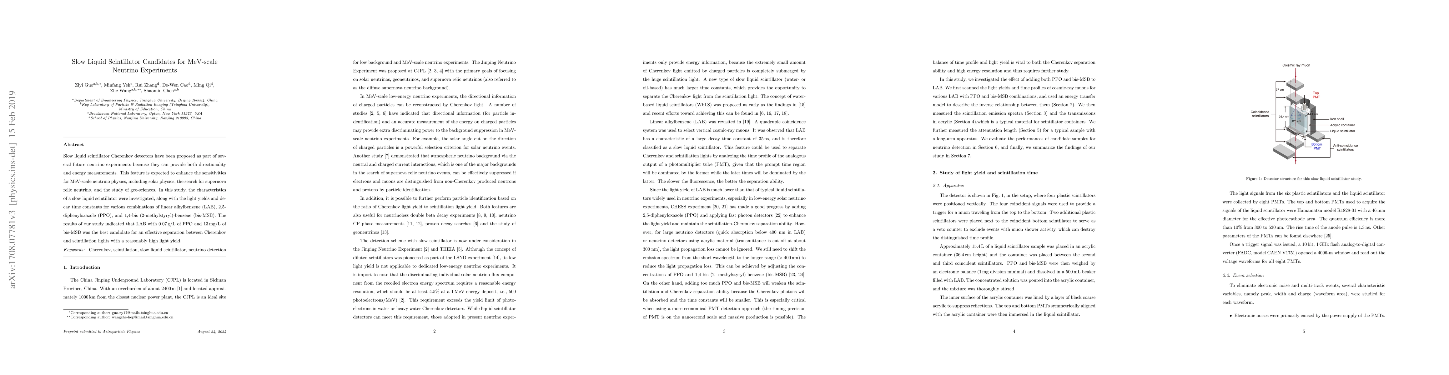This paper investigates slow liquid scintillator candidates for MeV-scale neutrino experiments, focusing on the combination of linear alkylbenzene (LAB), 2,5-diphenyloxazole (PPO), and 1,4-bis (2-methylstyryl)-benzene (bis-MSB). The optimal composition found is LAB with 0.07 g/L PPO and 13 mg/L bis-MSB, offering high light yield and effective separation between Cherenkov and scintillation lights.