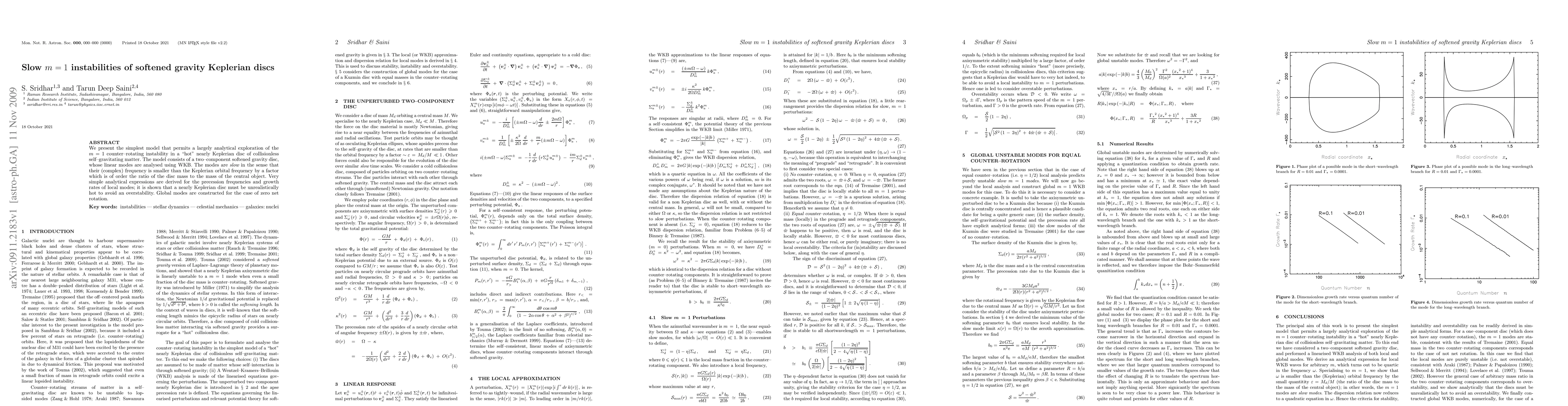 We present the simplest model that permits a largely analytical exploration of the m=1 counter-rotating instability in a "hot" nearly Keplerian disc of collisionless self-gravitating matter. The model consists of a two-component softened gravity disc, whose linear modes are analysed using WKB. The modes are slow in the sense that their (complex) frequency is smaller than the Keplerian orbital frequency by a factor which is of order the ratio of the disc mass to the mass of the central object. Very simple analytical expressions are derived for the precession frequencies and growth rates of local modes; it is shown that a nearly Keplerian disc must be unrealistically hot to avoid an overstability. Global modes are constructed for the case of zero net rotation.