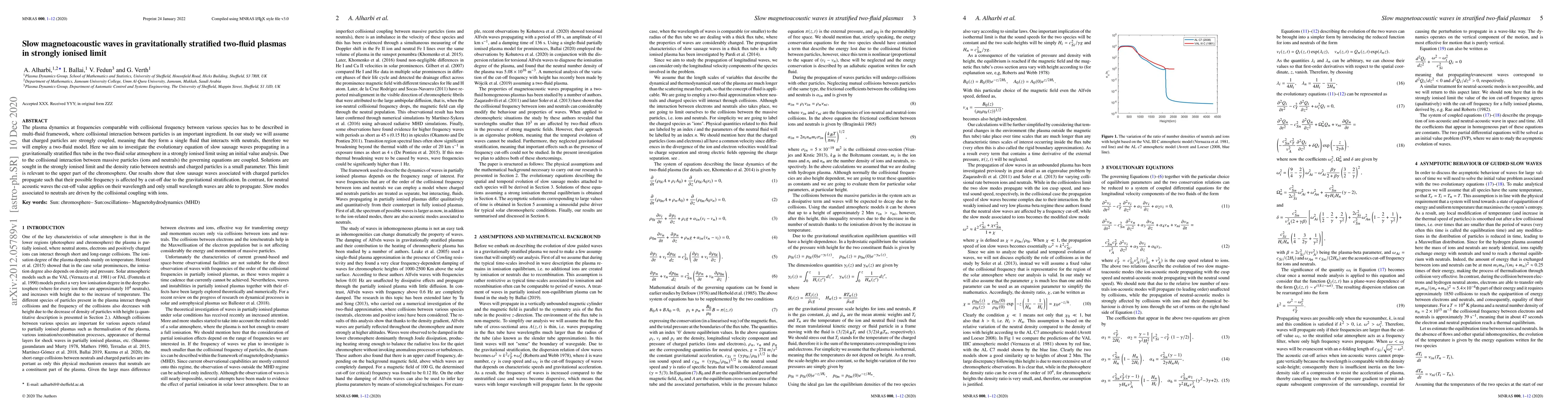 The plasma dynamics at frequencies comparable with collisional frequency between various species has to be described in multi-fluid framework, where collisional interaction between particles is an important ingredient. In our study we will assume that charged particles are strongly coupled, meaning that they form a single fluid that interacts with neutrals, therefore we will employ a two-fluid model. Here we aim to investigate the evolutionary equation of slow sausage waves propagating in a gravitationally stratified flux tube in the two-fluid solar atmosphere in a strongly ionised limit using an initial value analysis. Due to the collisional interaction between massive particles (ions and neutrals) the governing equations are coupled. Solutions are sought in the strongly ionised limit and the density ratio between neutrals and charged particles is a small parameter. This limit is relevant to the upper part of the chromosphere. Our results show that slow sausage waves associated with charged particles propagate such that their possible frequency is affected by a cut-off due to the gravitational stratification. contrast, for neutral acoustic waves the cut-off value applies on their wavelength and only small wavelength waves are able to propagate. Slow modes associated to neutrals are driven by the collisional coupling with ions.