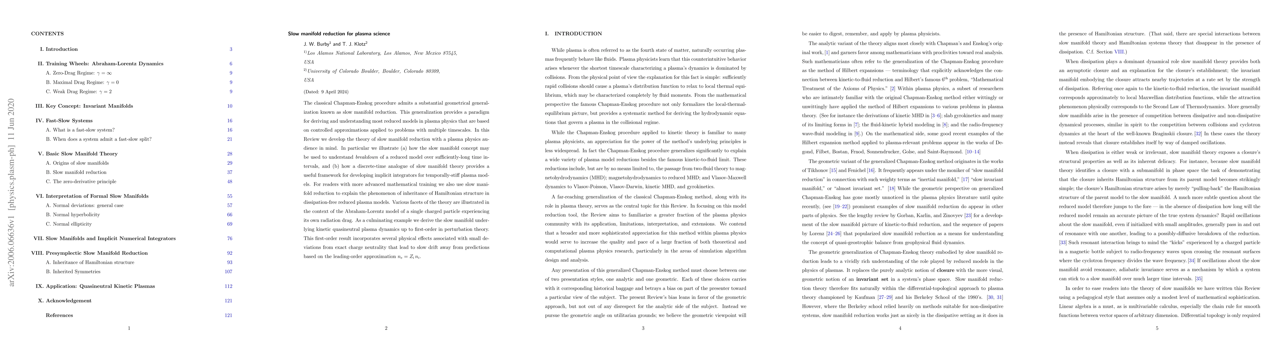 This paper reviews slow manifold reduction theory for plasma physics, illustrating its application to understand model breakdown, implicit integrators for stiff models, and inheritance of Hamiltonian structure in reduced models.
