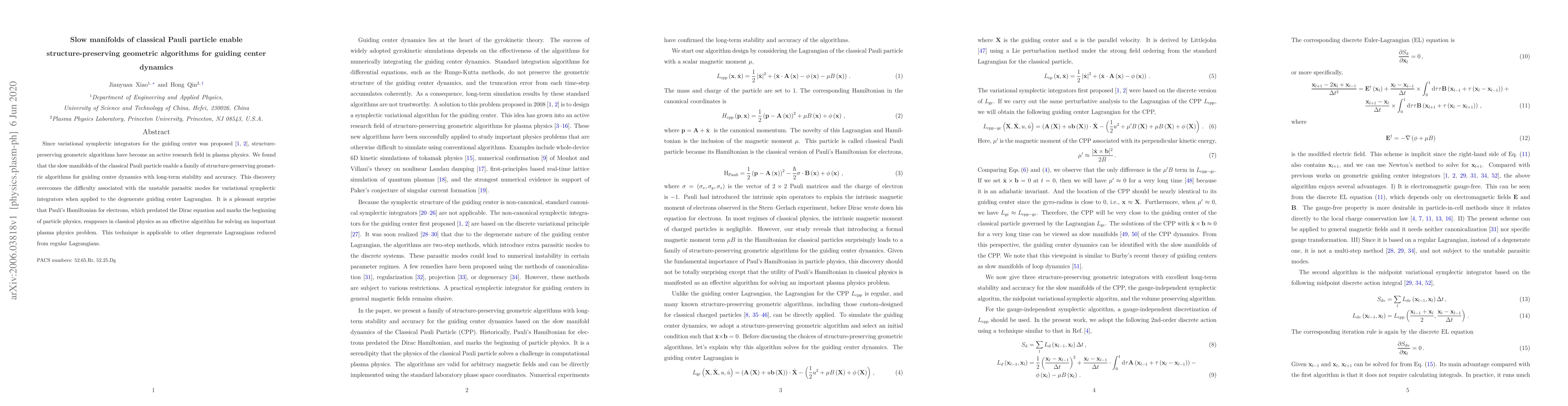 Since variational symplectic integrators for the guiding center was proposed [1,2], structure-preserving geometric algorithms have become an active research field in plasma physics. We found that the slow manifolds of the classical Pauli particle enable a family of structure-preserving geometric algorithms for guiding center dynamics with long-term stability and accuracy. This discovery overcomes the difficulty associated with the unstable parasitic modes for variational symplectic integrators when applied to the degenerate guiding center Lagrangian. It is a pleasant surprise that Pauli's Hamiltonian for electrons, which predated the Dirac equation and marks the beginning of particle physics, reappears in classical physics as an effective algorithm for solving an important plasma physics problem. This technique is applicable to other degenerate Lagrangians reduced from regular Lagrangians.