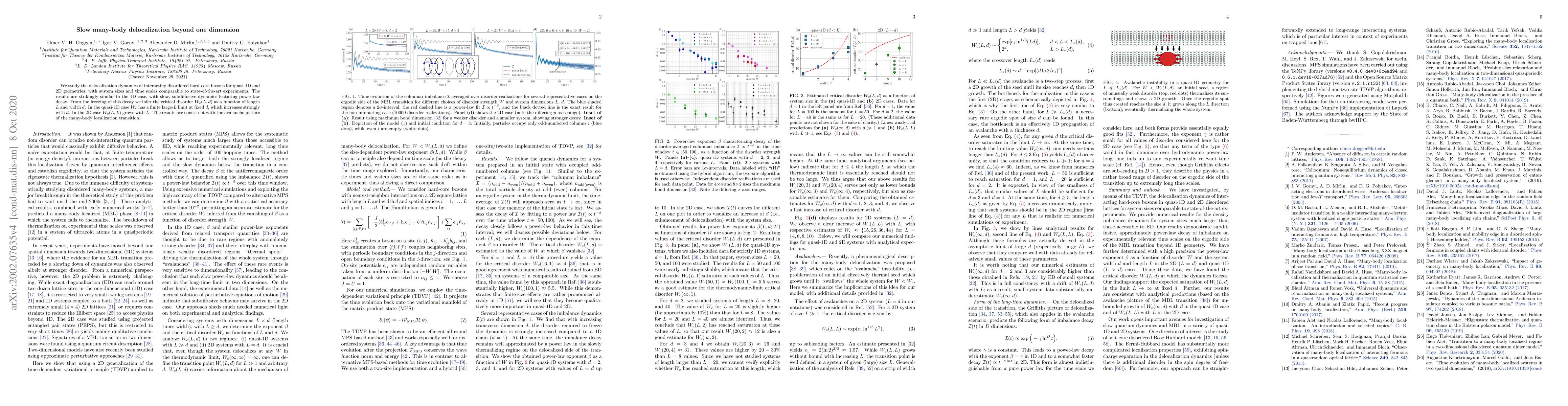 We study the delocalization dynamics of interacting disordered hard-core bosons for quasi-1D and 2D geometries, with system sizes and time scales comparable to state-of-the-art experiments. The results are strikingly similar to the 1D case, with slow, subdiffusive dynamics featuring power-law decay. From the freezing of this decay we infer the critical disorder $W_c(L, d)$ as a function of length $L$ and width $d$. In the quasi-1D case $W_c$ has a finite large-$L$ limit at fixed $d$, which increases strongly with $d$. In the 2D case $W_c(L,L)$ grows with $L$. The results are consistent with the avalanche picture of the many-body localization transition.
