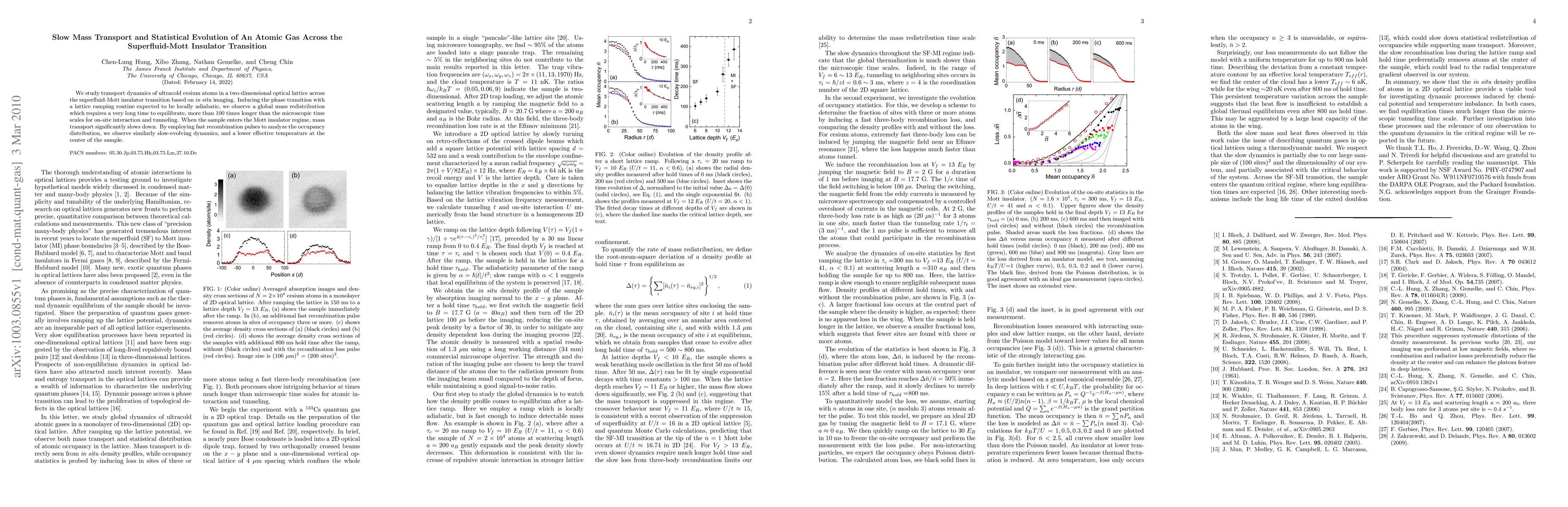 This paper investigates the slow mass transport dynamics of ultracold cesium atoms in a two-dimensional optical lattice during the superfluid-Mott insulator transition, revealing a global mass redistribution that takes over 100 times longer to equilibrate than microscopic processes. In the Mott insulator regime, mass transport slows significantly, accompanied by a lower effective temperature at the sample's center.