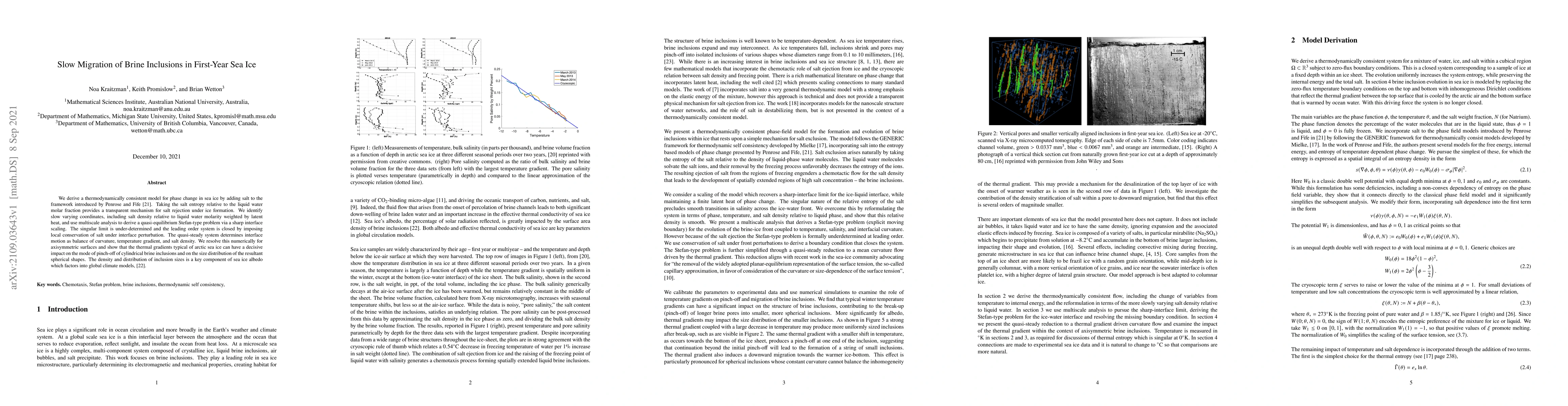 Researchers developed a thermodynamically consistent model to study the slow migration of brine inclusions in sea ice, finding that thermal gradients can significantly impact inclusion size distribution and sea ice albedo.