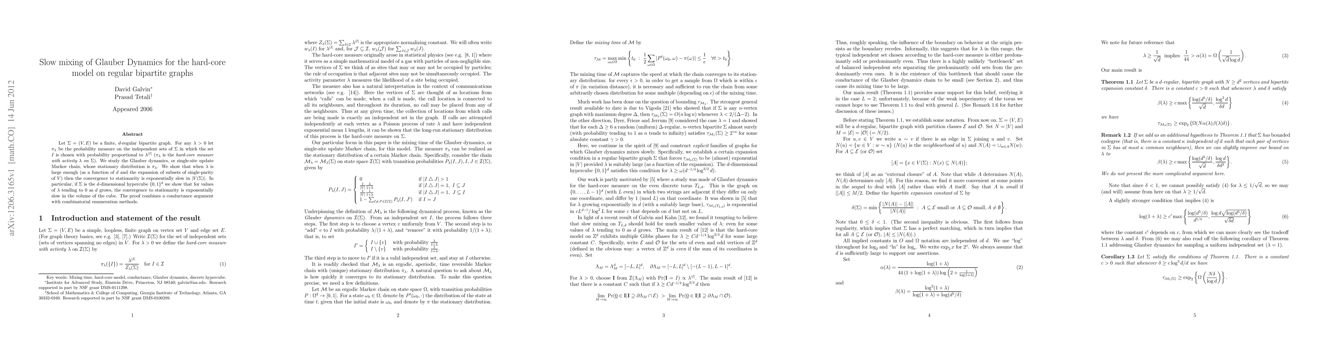 Let $\gS=(V,E)$ be a finite, $d$-regular bipartite graph. For any $\lambda>0$ let $\pi_\lambda$ be the probability measure on the independent sets of $\gS$ in which the set $I$ is chosen with probability proportional to $\lambda^{|I|}$ ($\pi_\lambda$ is the {\em hard-core measure with activity $\lambda$ on $\gS$}). We study the Glauber dynamics, or single-site update Markov chain, whose stationary distribution is $\pi_\lambda$. We show that when $\lambda$ is large enough (as a function of $d$ and the expansion of subsets of single-parity of $V$) then the convergence to stationarity is exponentially slow in $|V(\gS)|$. In particular, if $\gS$ is the $d$-dimensional hypercube $\{0,1\}^d$ we show that for values of $\lambda$ tending to 0 as $d$ grows, the convergence to stationarity is exponentially slow in the volume of the cube. The proof combines a conductance argument with combinatorial enumeration methods.