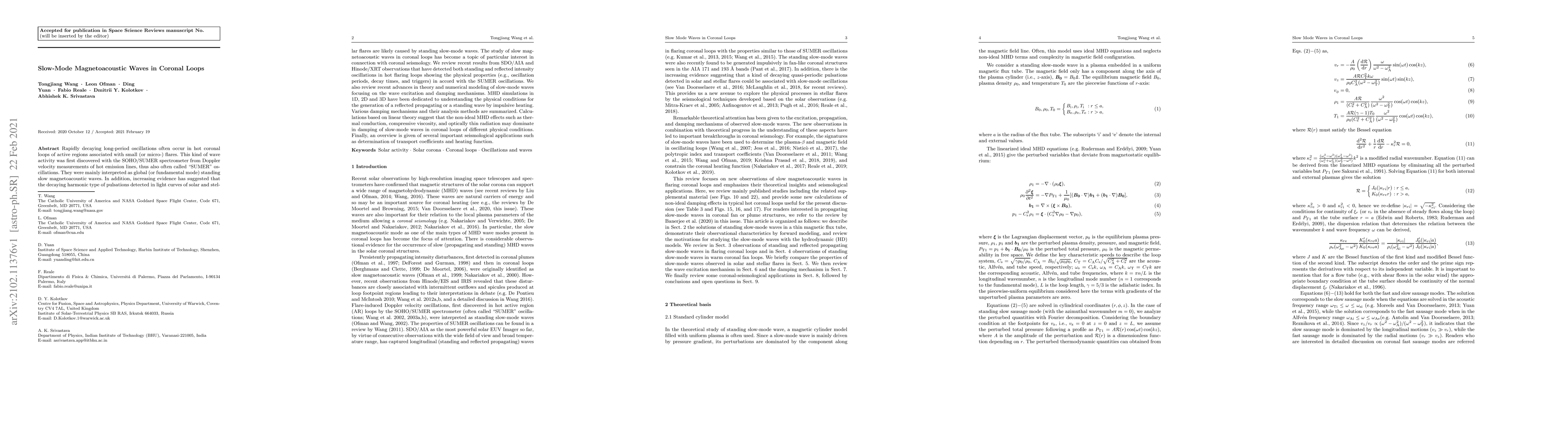 This paper reviews recent findings on slow-mode magnetoacoustic waves in coronal loops, detected via SDO/AIA and Hinode/XRT, and discusses their properties and theoretical modeling, including wave excitation and damping mechanisms. It highlights the significance of these waves in coronal seismology and their applications in determining transport coefficients and heating functions.