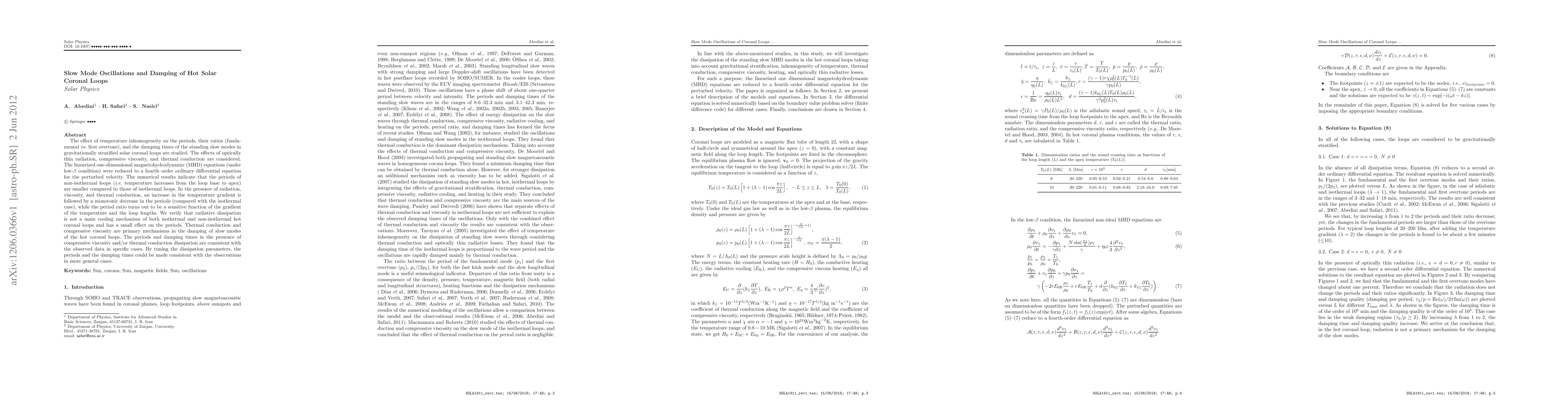 This paper investigates the impact of temperature inhomogeneity on the periods and damping times of slow mode oscillations in solar coronal loops, finding that non-isothermal loops exhibit shorter periods than isothermal ones. It concludes that thermal conduction and compressive viscosity are the primary damping mechanisms, while radiative dissipation has a minor effect on periods.
