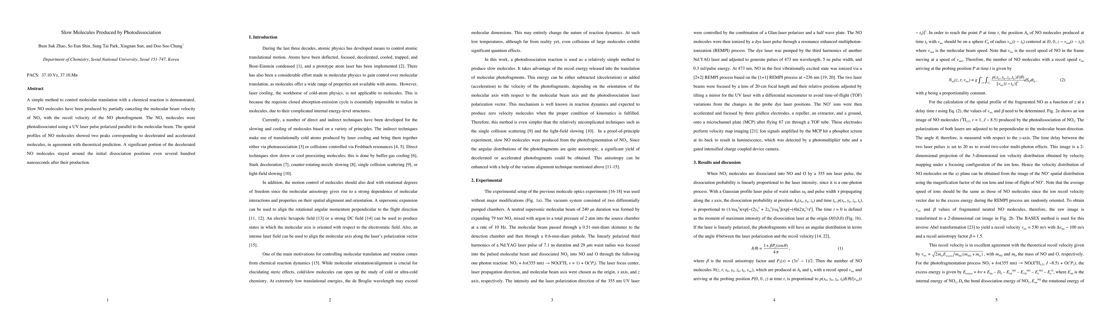 A simple method to control molecular translation with a chemical reaction is demonstrated. Slow NO molecules have been produced by partially canceling the molecular beam velocity of NO$_2$ with the recoil velocity of the NO photofragment. The NO$_2$ molecules were photodissociated using a UV laser pulse polarized parallel to the molecular beam. The spatial profiles of NO molecules showed two peaks corresponding to decelerated and accelerated molecules, in agreement with theoretical prediction. A significant portion of the decelerated NO molecules stayed around the initial dissociation positions even several hundred nanoseconds after their production.