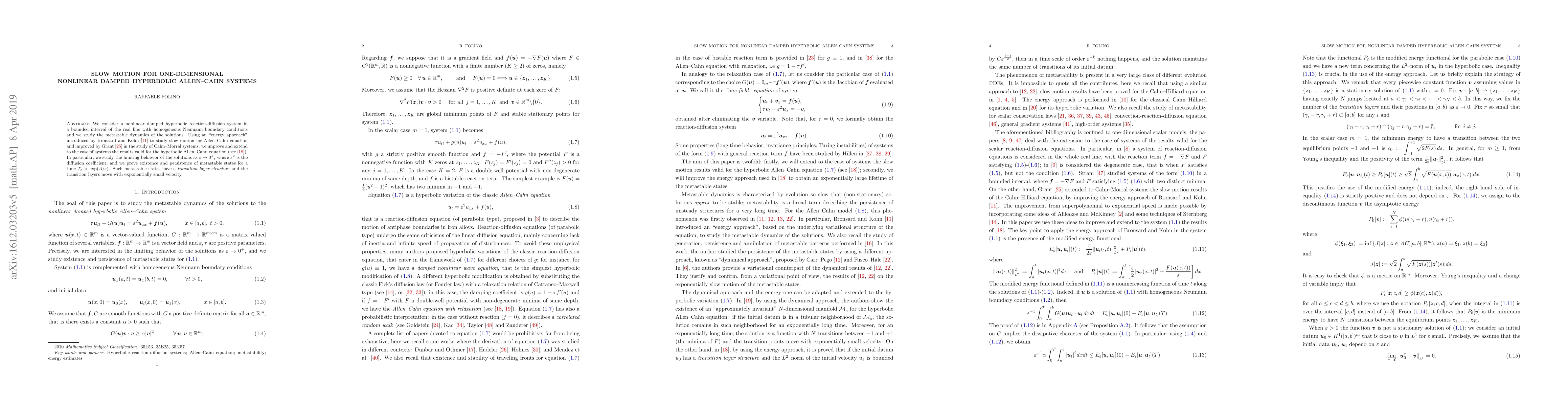 This paper investigates the metastable dynamics of a nonlinear damped hyperbolic reaction-diffusion system using an energy approach. It proves the existence and persistence of metastable states with transition layers moving at exponentially small velocities as the diffusion coefficient approaches zero.