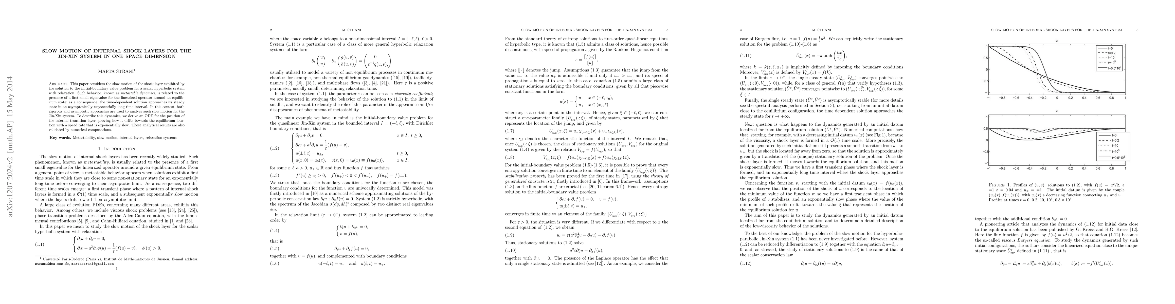 This paper considers the slow motion of the shock layer exhibited by the solution to the initial-boundary value problem for a scalar hyperbolic system with relaxation. Such behavior, known as metastable dynamics, is related to the presence of a first small eigenvalue for the linearized operator around an equilibrium state; as a consequence, the time-dependent solution approaches its steady state in an asymptotically exponentially long time interval. In this contest, both rigorous and asymptotic approaches are used to analyze such slow motion for the Jin-Xin system. To describe this dynamics we derive an ODE for the the position of the internal transition layer, proving how it drifts towards the equilibrium location with a speed rate that is exponentially slow. These analytical results are also validated by numerical computations.