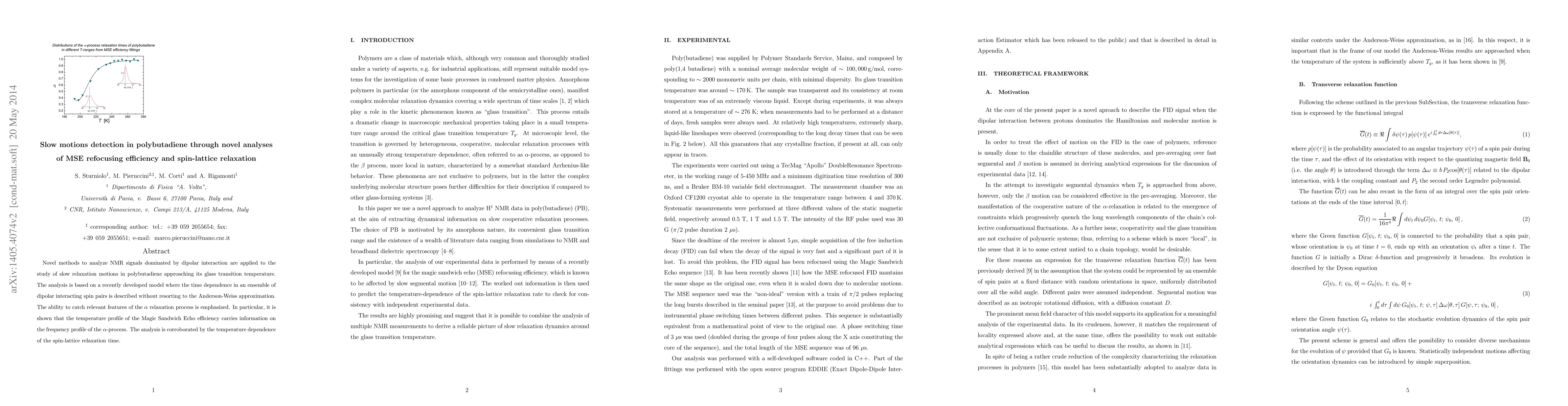 Novel methods to analyze NMR signals dominated by dipolar interaction are applied to the study of slow relaxation motions in polybutadiene approaching its glass transition temperature. The analysis is based on a recently developed model where the time dependence in an ensemble of dipolar interacting spin pairs is described without resorting to the Anderson-Weiss approximation. The ability to catch relevant features of the $\alpha$ relaxation process is emphasized. In particular, it is shown that the temperature profile of the Magic Sandwich Echo efficiency carries information on the frequency profile of the $\alpha$-process. The analysis is corroborated by the temperature dependence of the spin-lattice relaxation time.