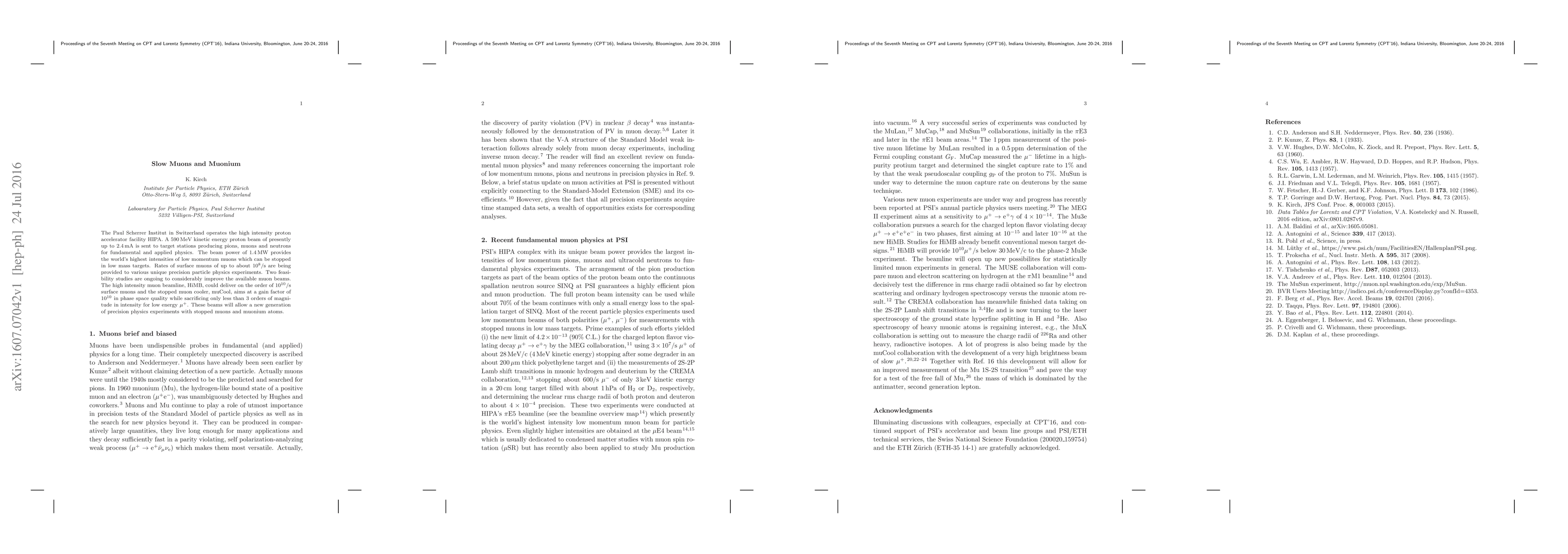 The Paul Scherrer Institut in Switzerland operates the high intensity proton accelerator facility HIPA. A 590 MeV kinetic energy proton beam of presently up to 2.4 mA is sent to target stations producing pions, muons and neutrons for fundamental and applied physics. The beam power of 1.4 MW provides the world's highest intensities of low momentum muons which can be stopped in low mass targets. Rates of surface muons of up to about $10^8$/s are being provided to various unique precision particle physics experiments. Two feasibility studies are ongoing to considerably improve the available muon beams. The high intensity muon beamline, HiMB, could deliver on the order of $10^{10}$/s surface muons and the stopped muon cooler, muCool, aims at a gain factor of $10^{10}$ in phase space quality while sacrificing only less than 3 orders of magnitude in intensity for low energy $\mu^+$. These beams will allow a new generation of precision physics experiments with stopped muons and muonium atoms.