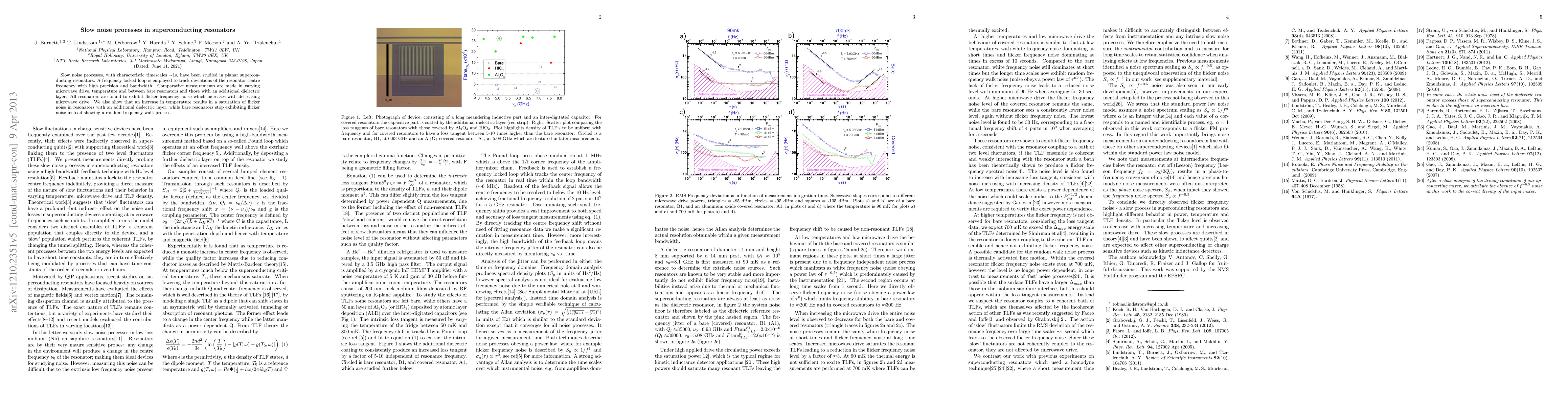 This study investigates slow noise processes in superconducting resonators, revealing flicker frequency noise that increases with lower microwave drive. Temperature effects show a saturation of flicker noise in resonators with dielectric layers, while bare resonators transition to a random frequency walk process.
