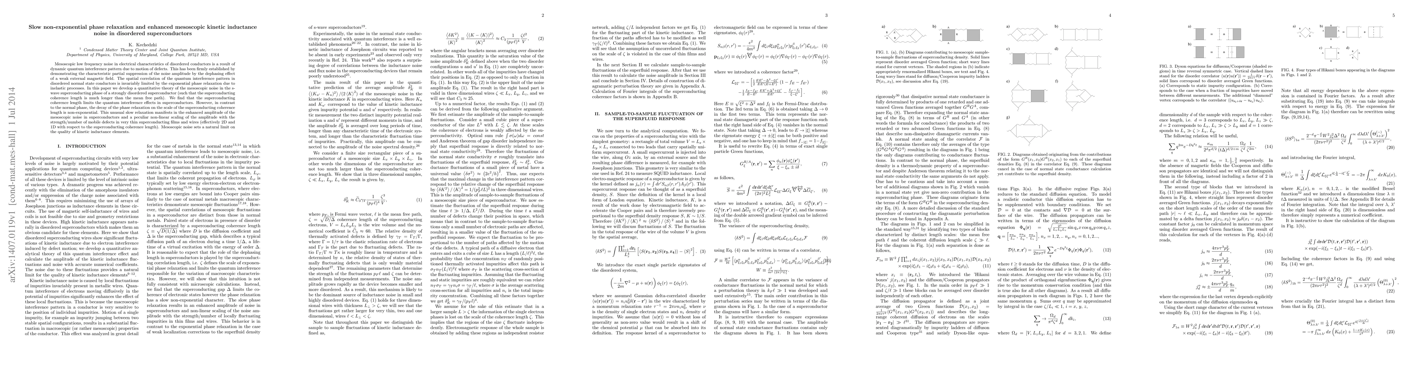 This paper develops a theory explaining the non-exponential phase relaxation and enhanced mesoscopic kinetic inductance noise in strongly disordered superconductors. Unlike normal conductors, the decay in superconductors is slow, leading to significant noise amplification in thin films and wires.